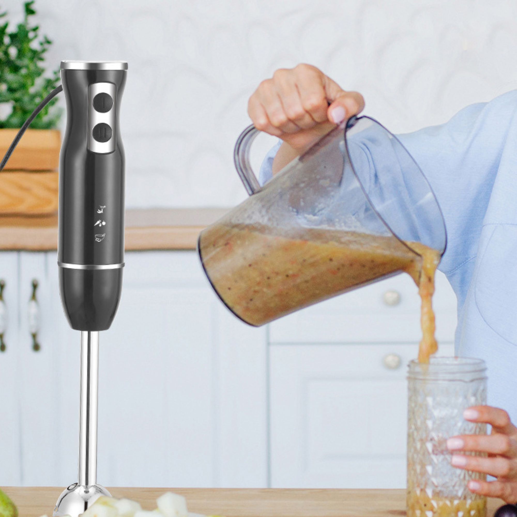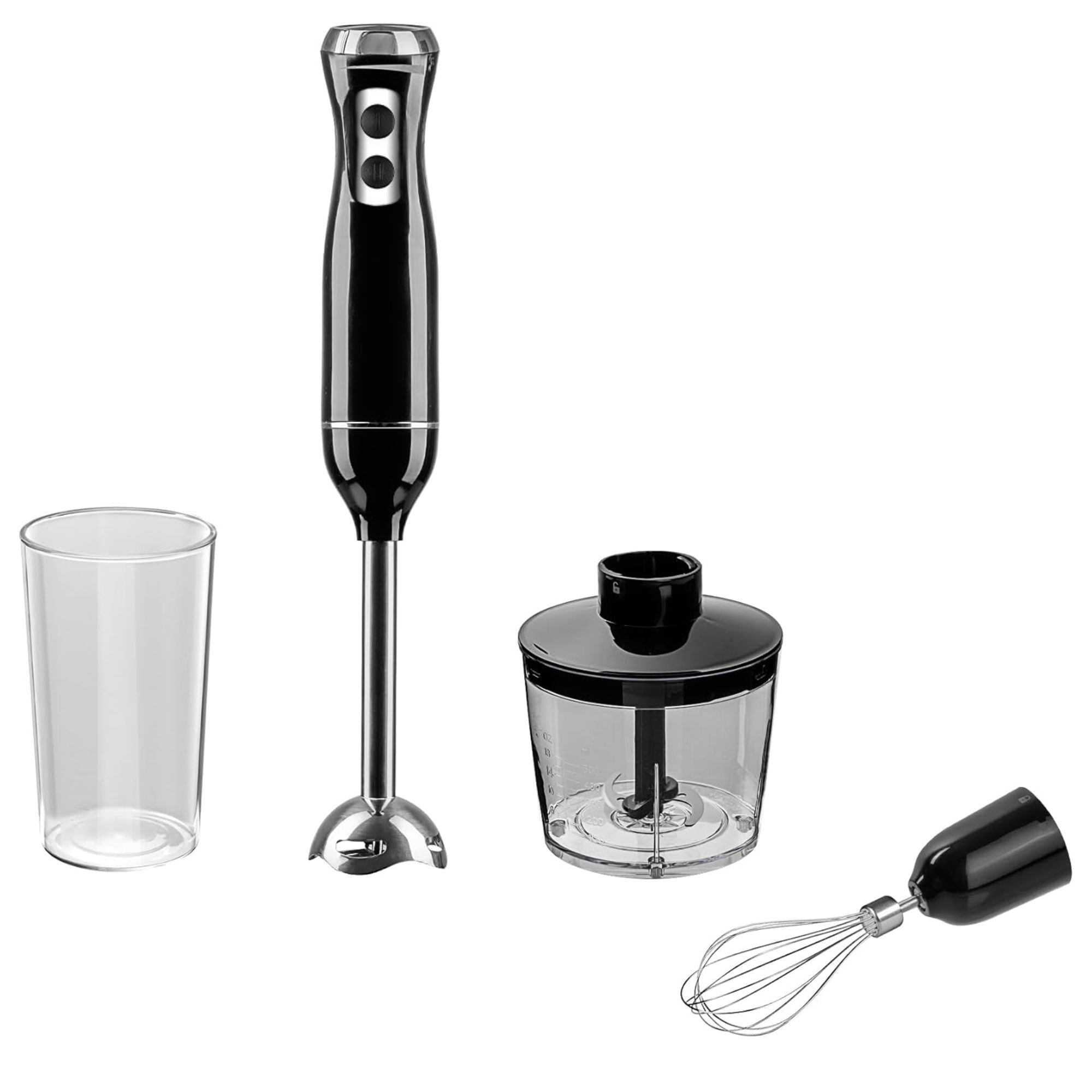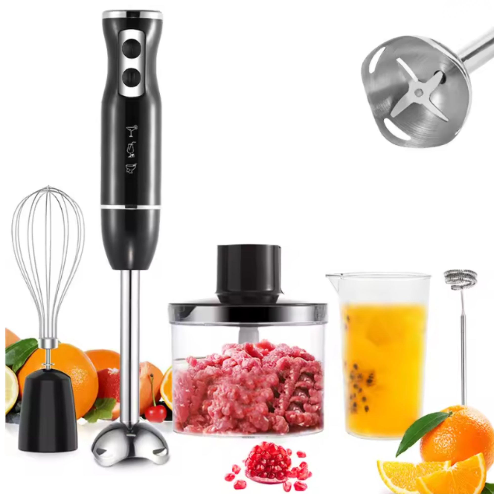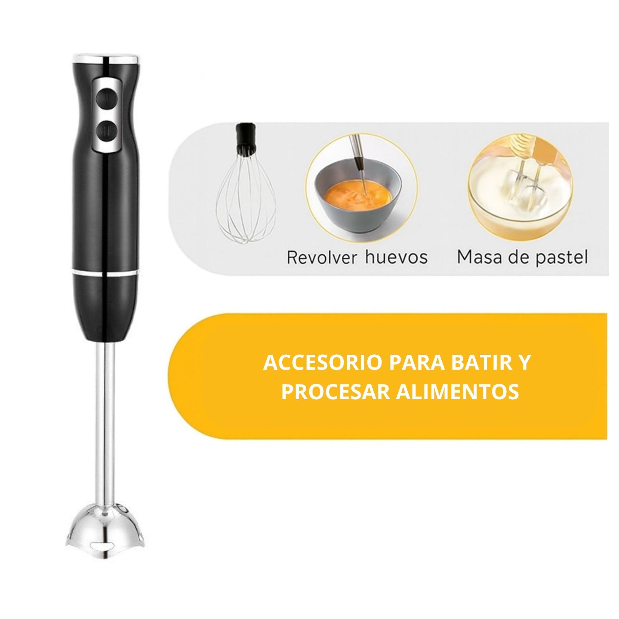 Batidora multifuncional 4 en 1 con accesorios intercambiables para batir, picar, triturar y mezclar, ideal para preparar jugos, cremas, salsas y más de manera rápida y práctica.