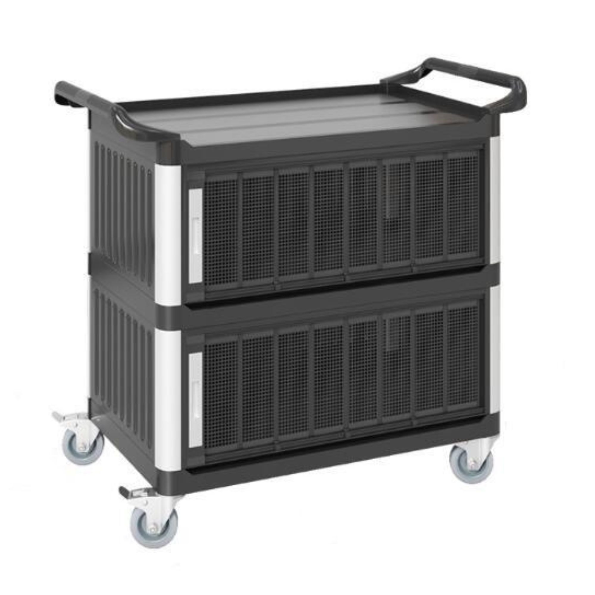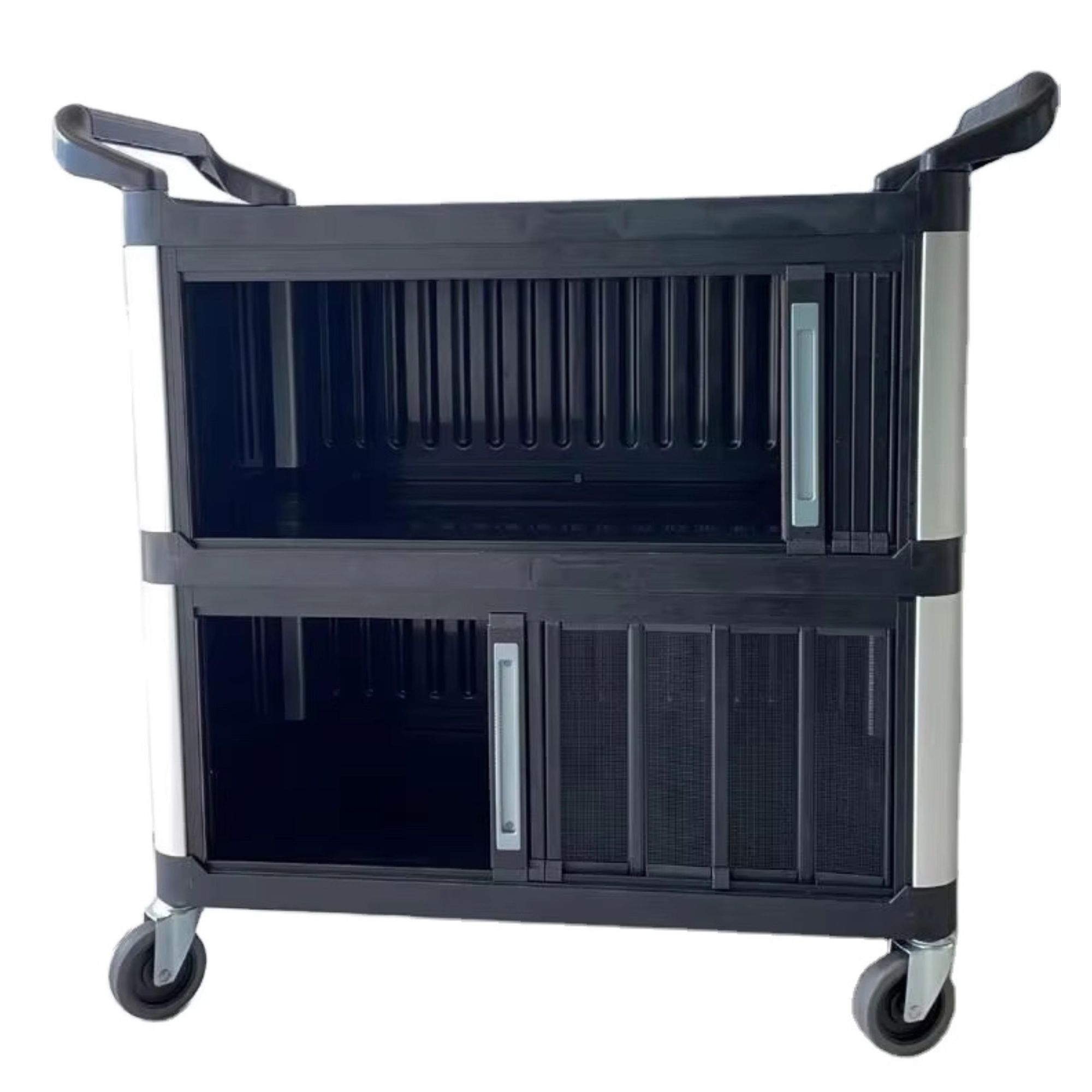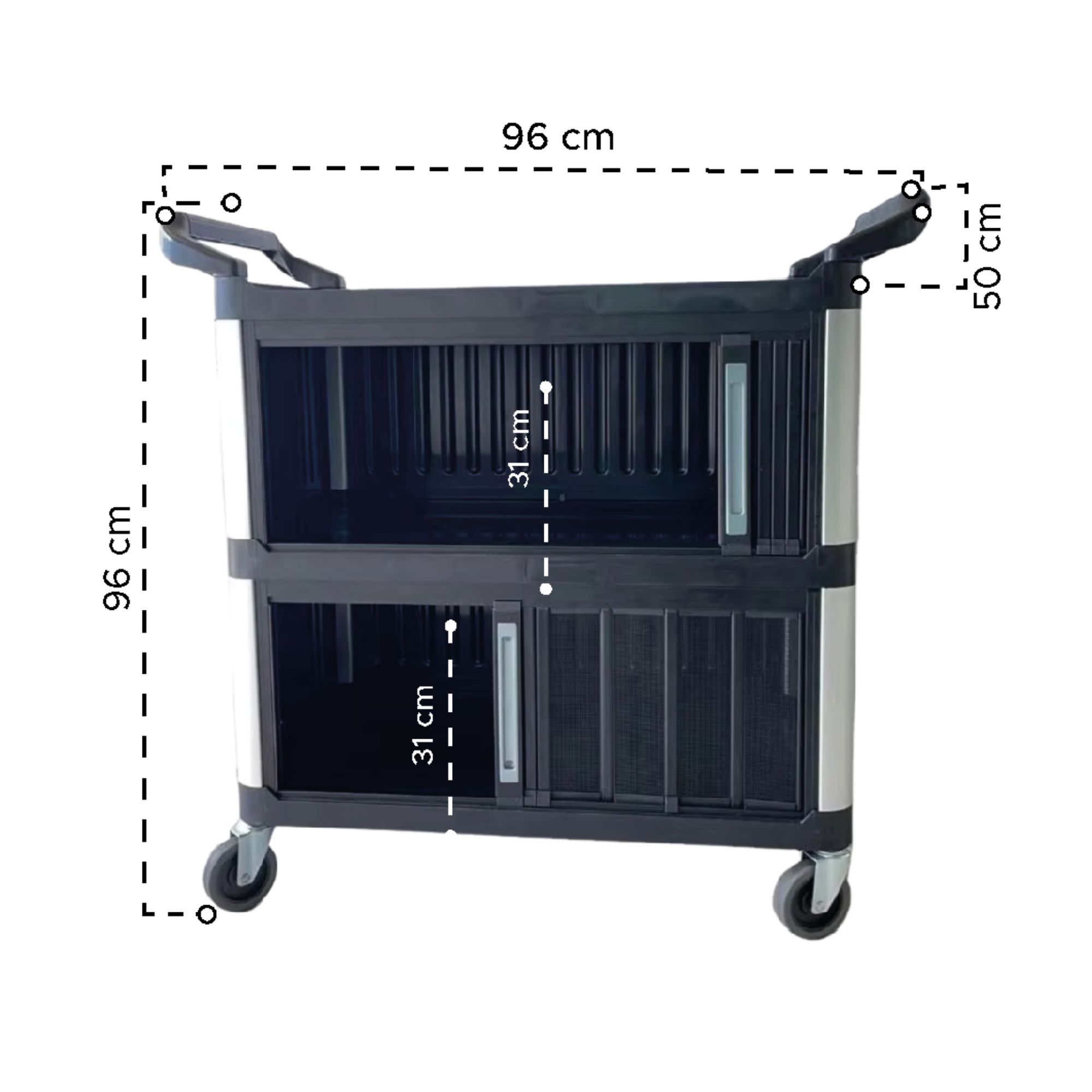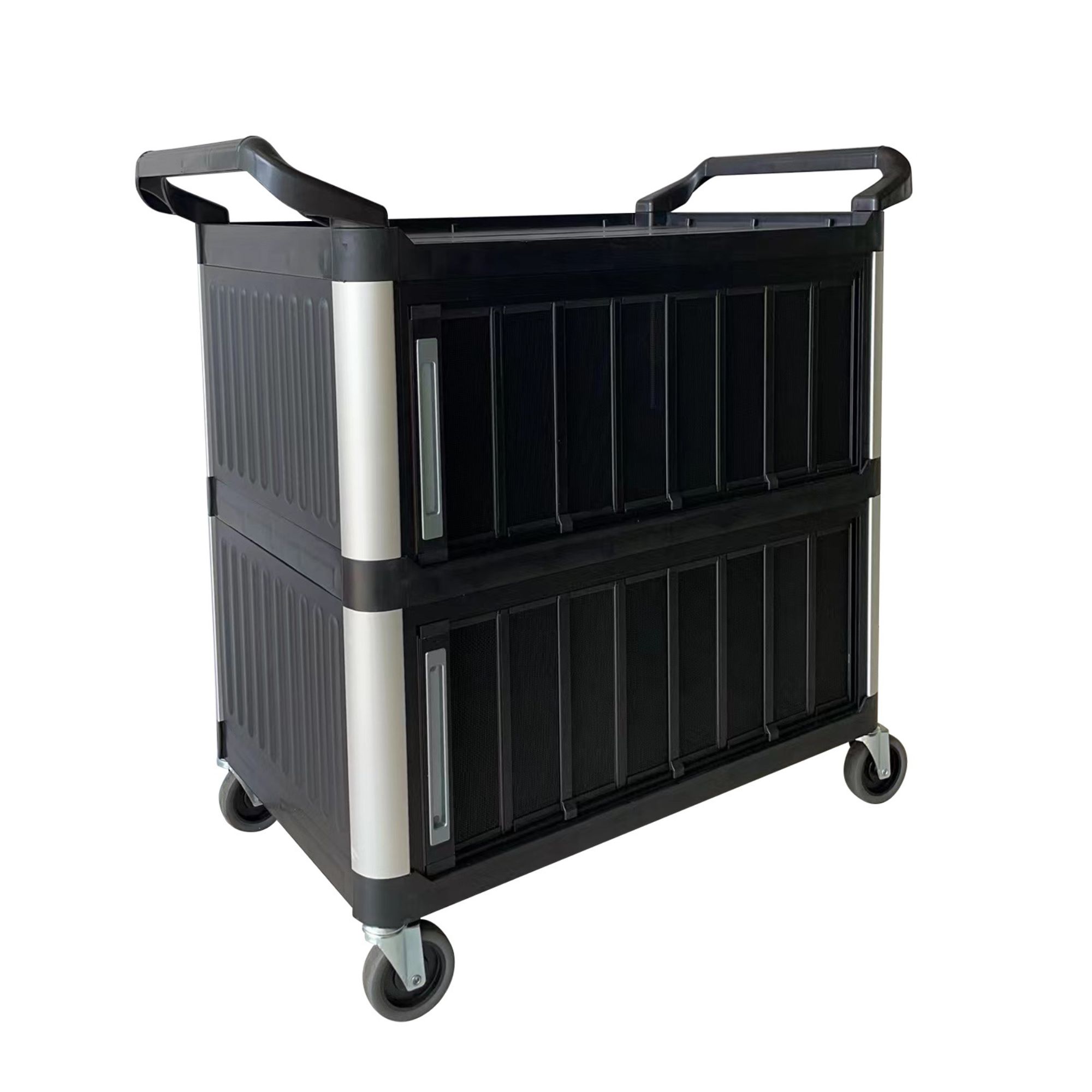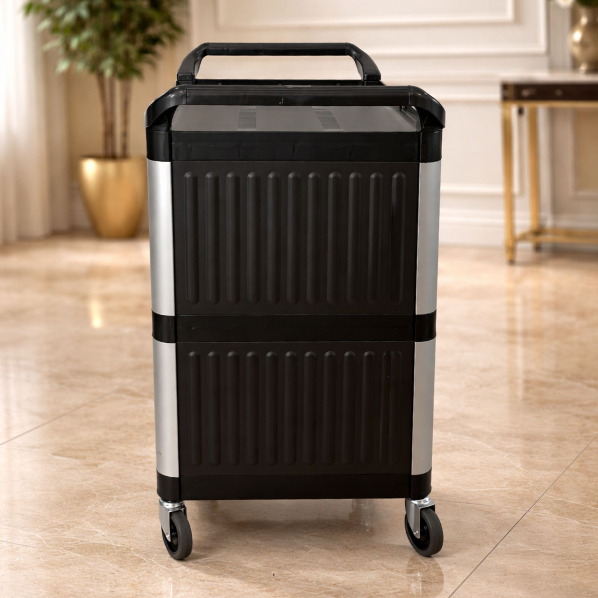 Carro de servicio tipo camarero plástico cerrado, diseñado para facilitar el transporte y la organización eficiente de insumos, utensilios y equipos. Sus ruedas giratorias de alta calidad garantizan movilidad suave y silenciosa incluso con carga completa Tiene una capacidad de carga de 135 kg.