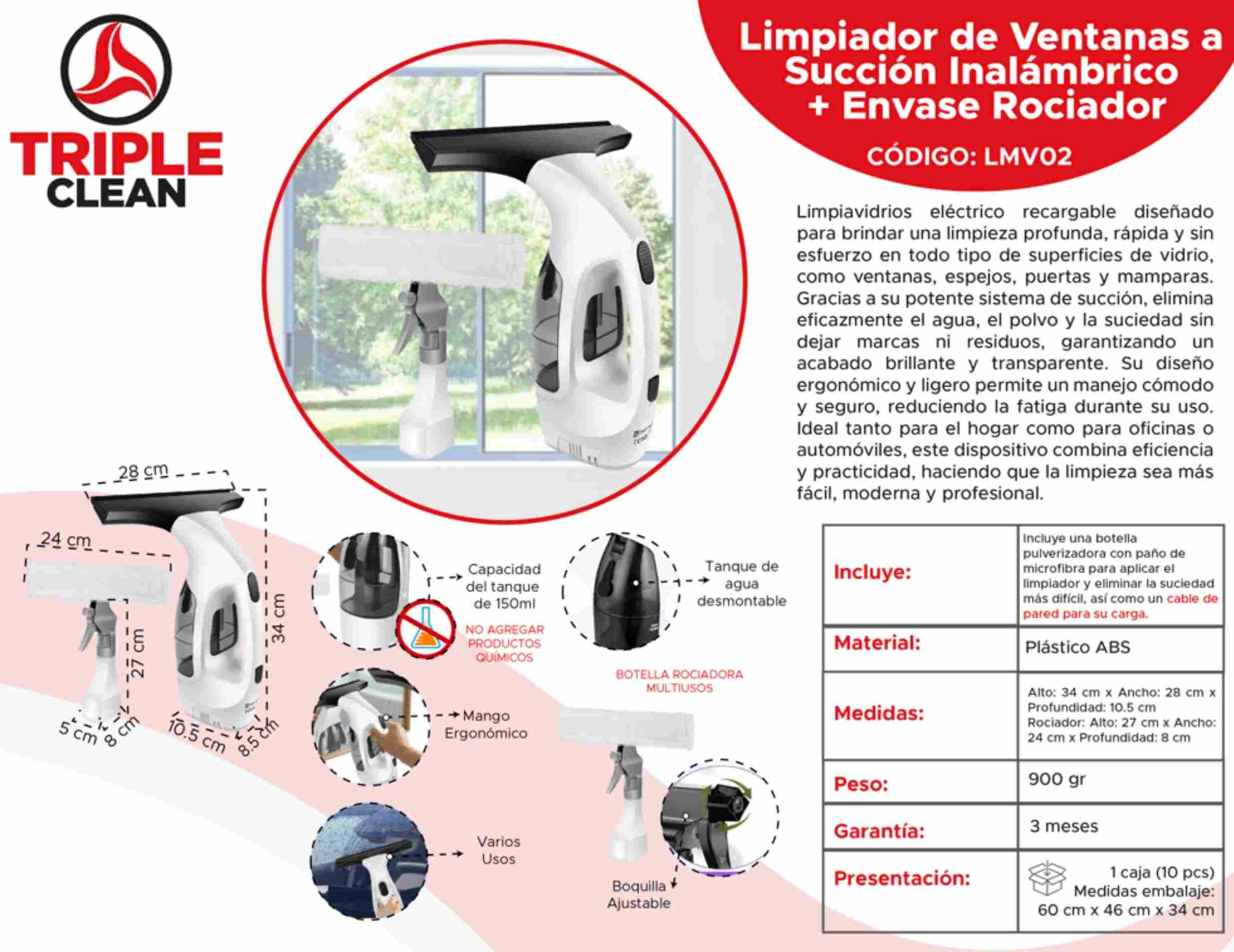 Limpiavidrios inalámbrico recargable con depósito transparente y paño de microfibra. Limpia, aspira y seca ventanas, espejos o vidrios sin dejar marcas, ofreciendo resultados rápidos y profesionales con su diseño inalámbrico y ergonómico. Incluye rociador con paño y cable USB para recarga.