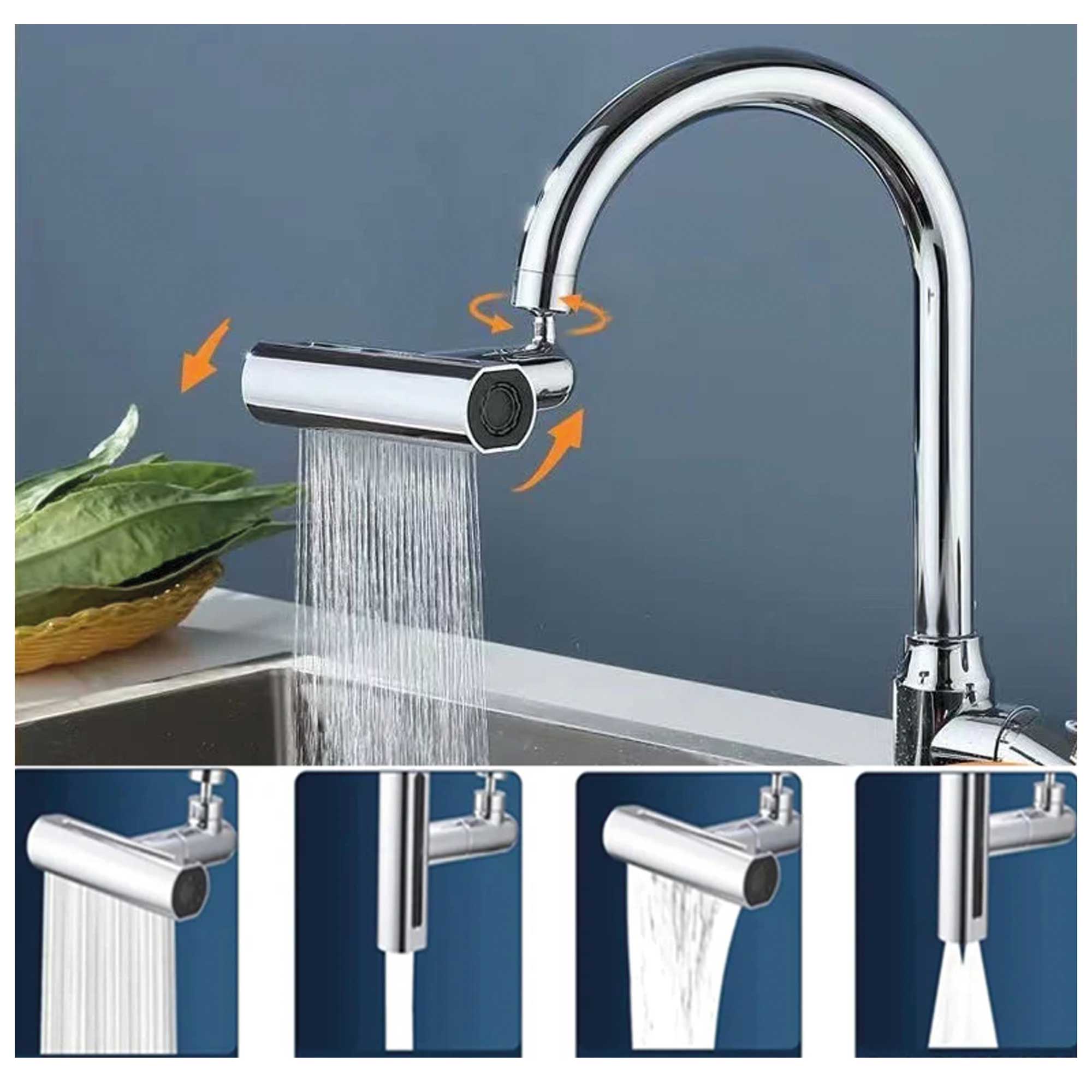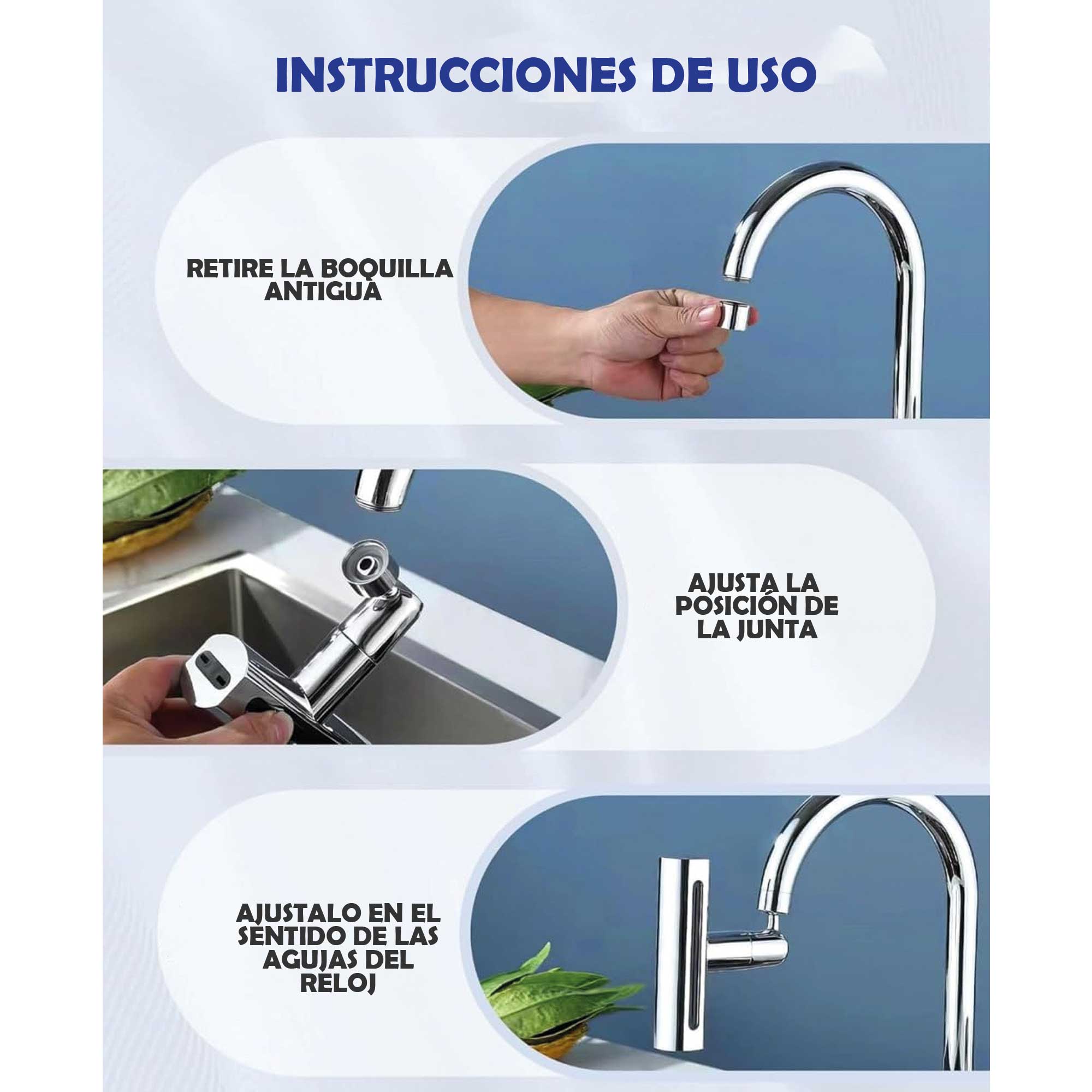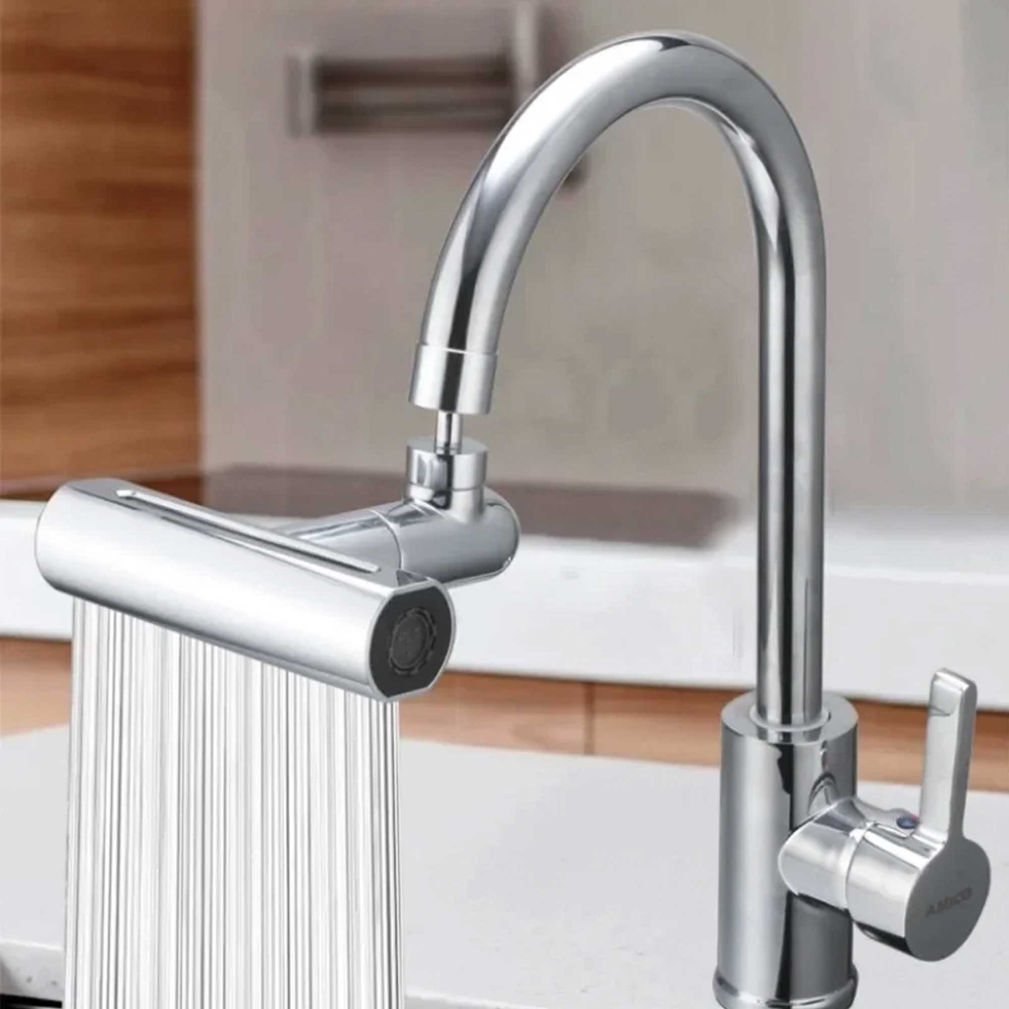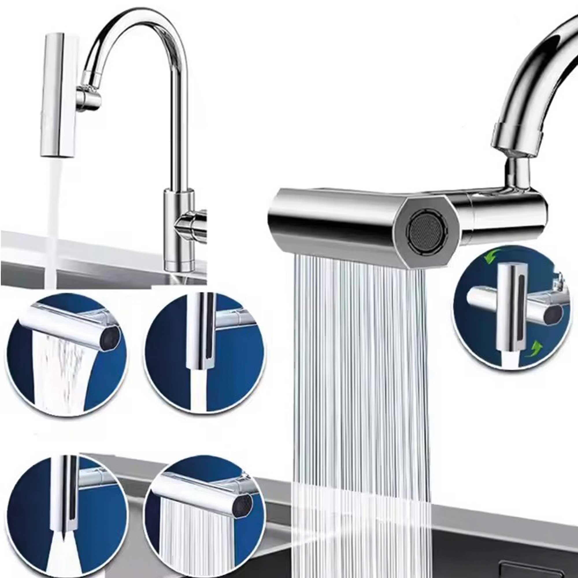 Accesorio para grifos de cocina diseñado para mejorar la funcionalidad. Se conecta al extremo del grifo existente.Puede girar en múltiples direcciones, , para facilitar el alcance del agua en diferentes áreas del fregadero.
