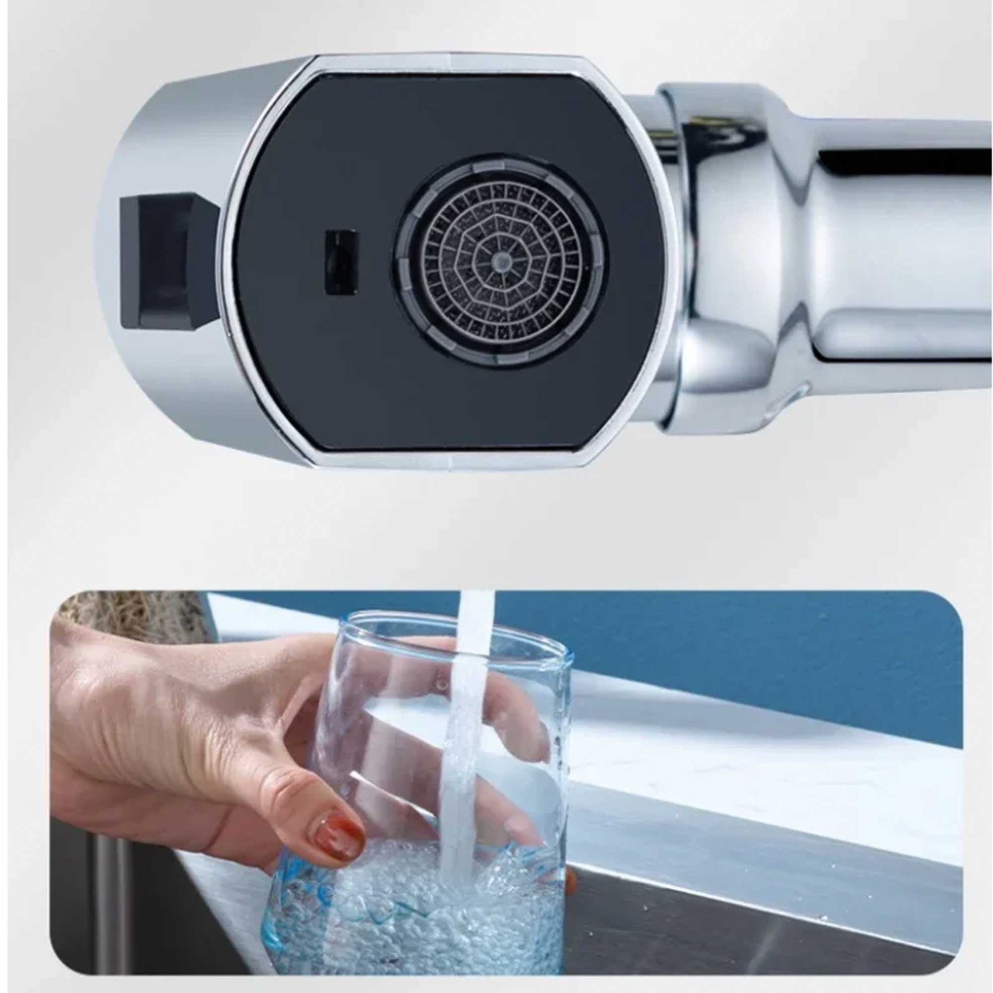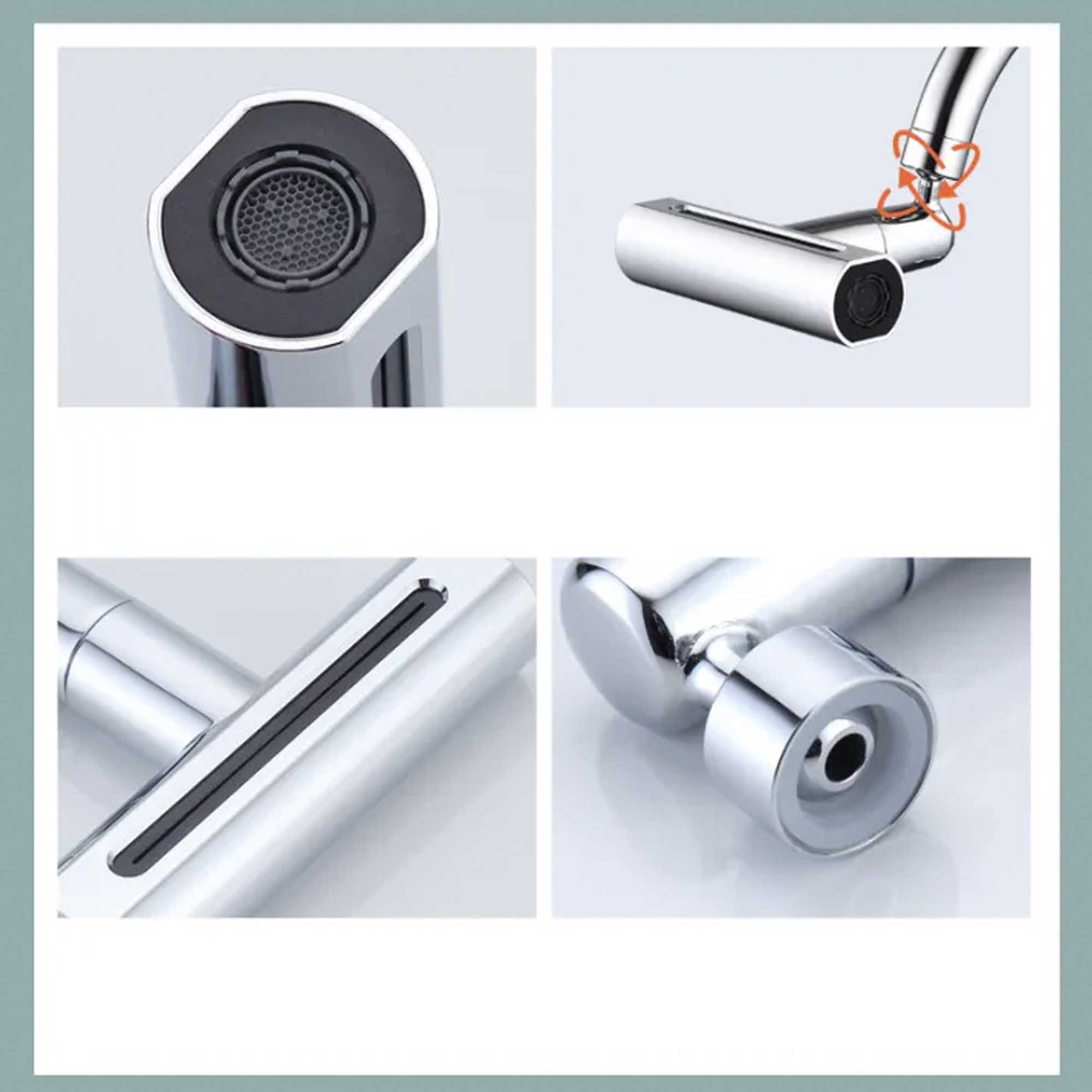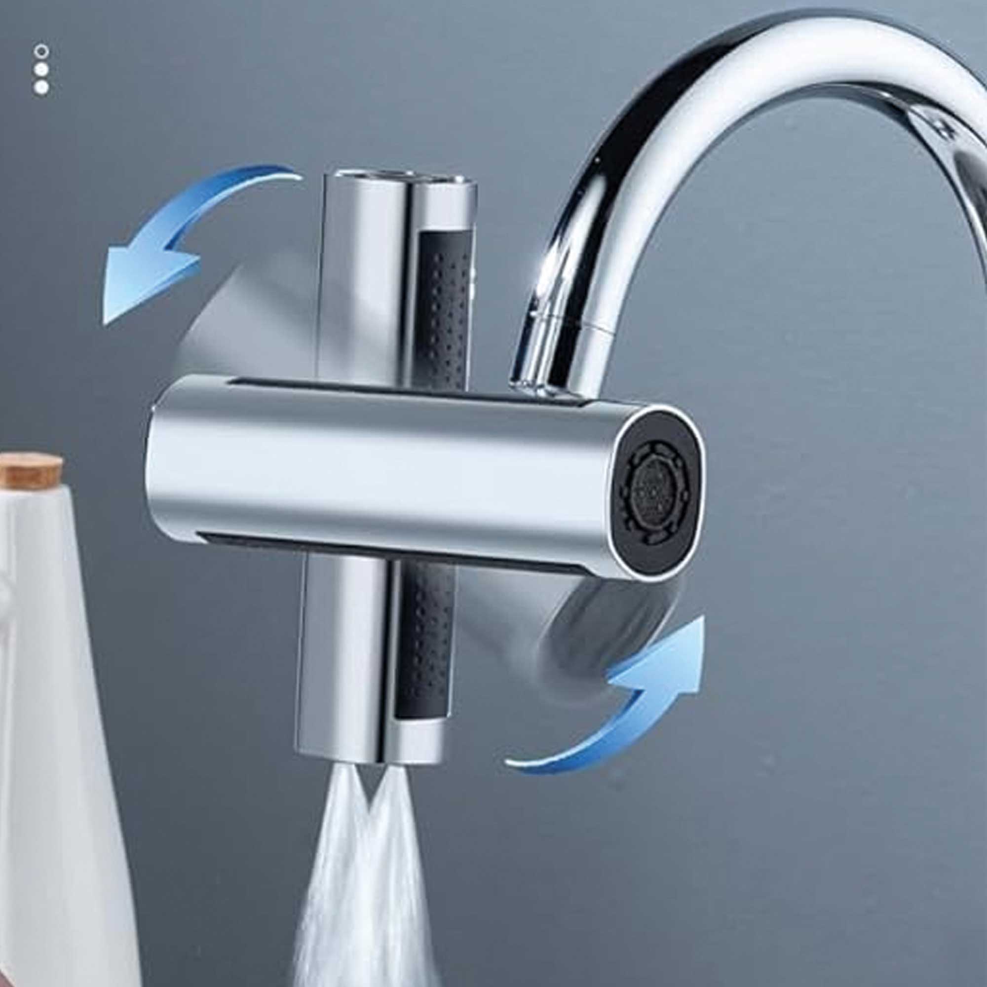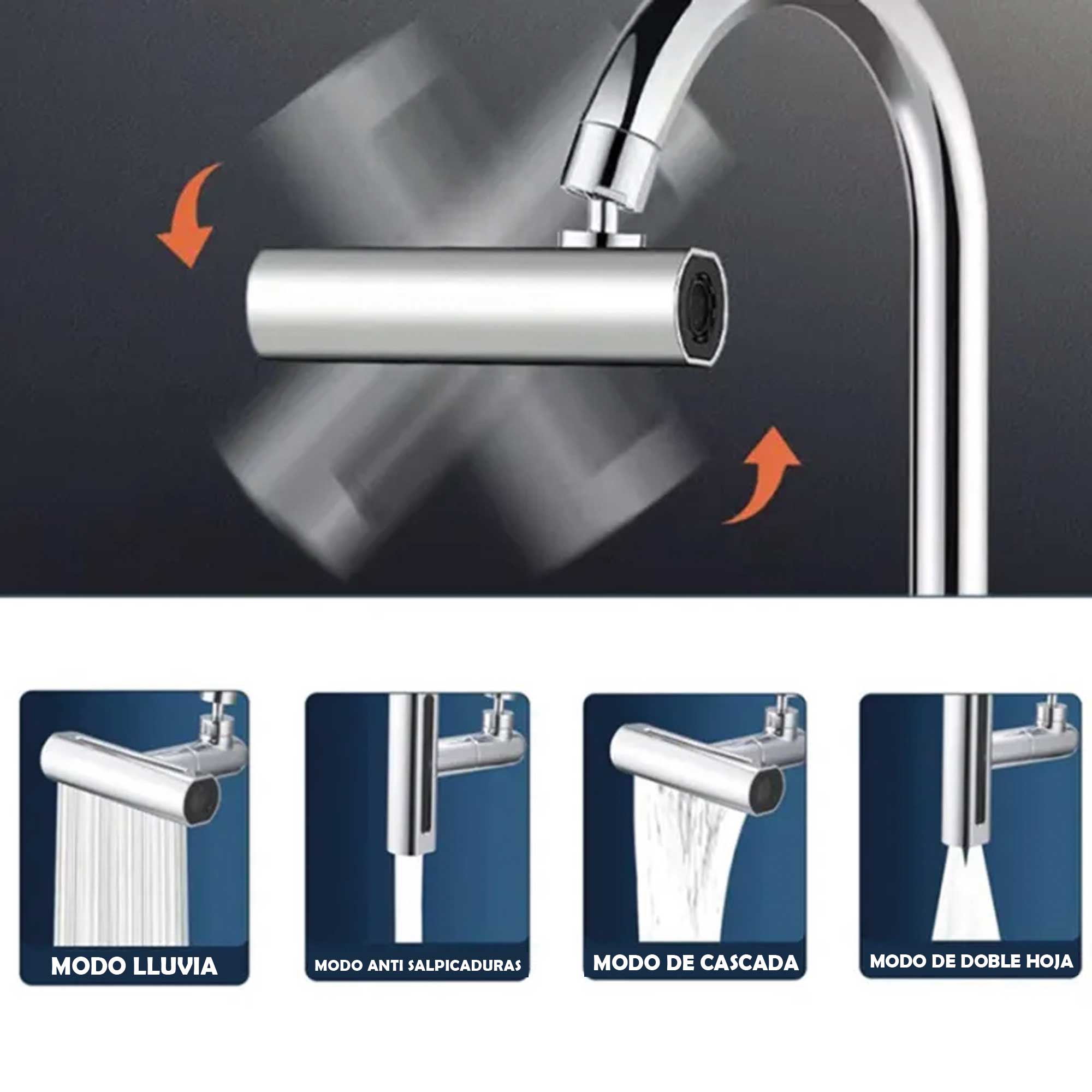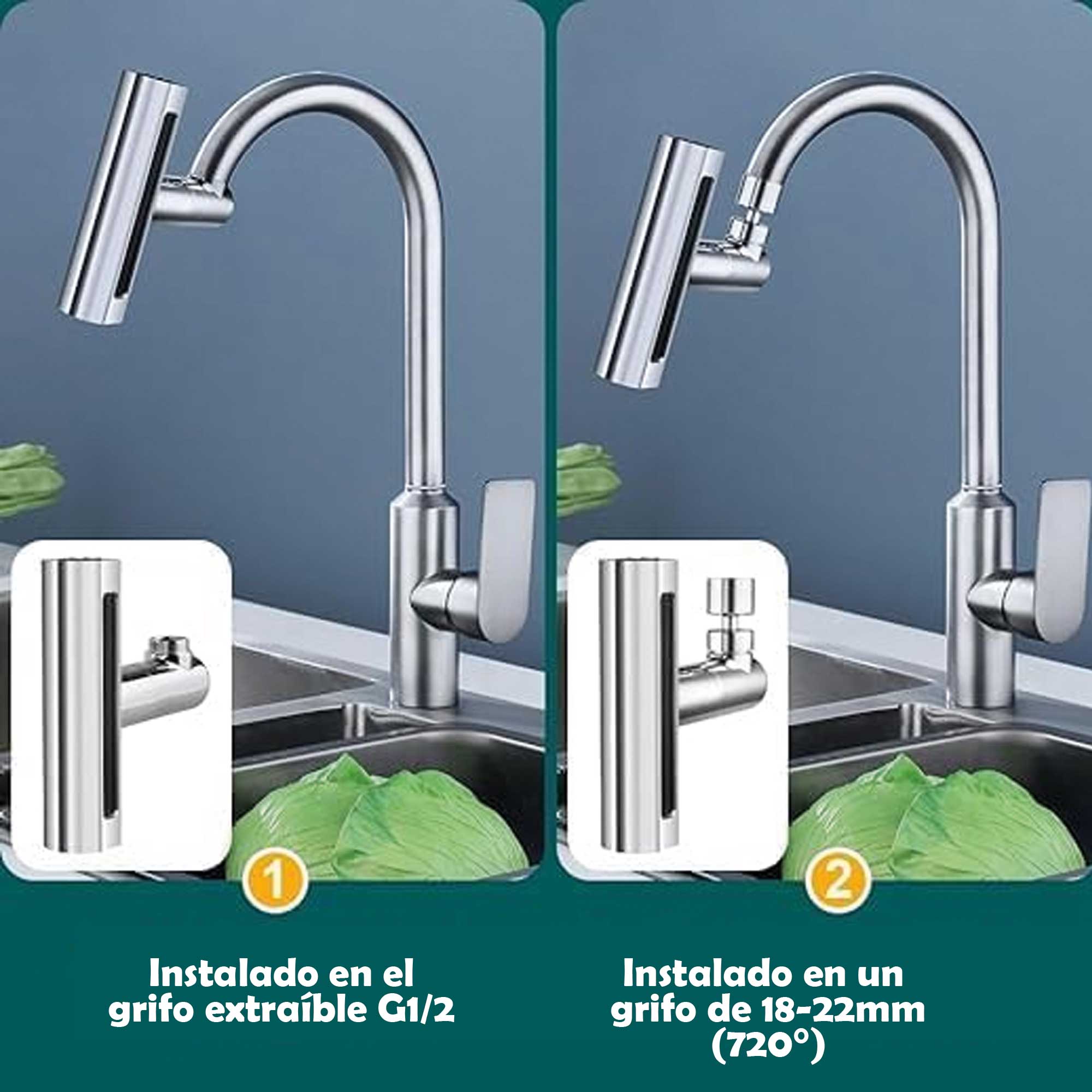 Accesorio para grifos de cocina diseñado para mejorar la funcionalidad. Se conecta al extremo del grifo existente.Puede girar en múltiples direcciones, , para facilitar el alcance del agua en diferentes áreas del fregadero.