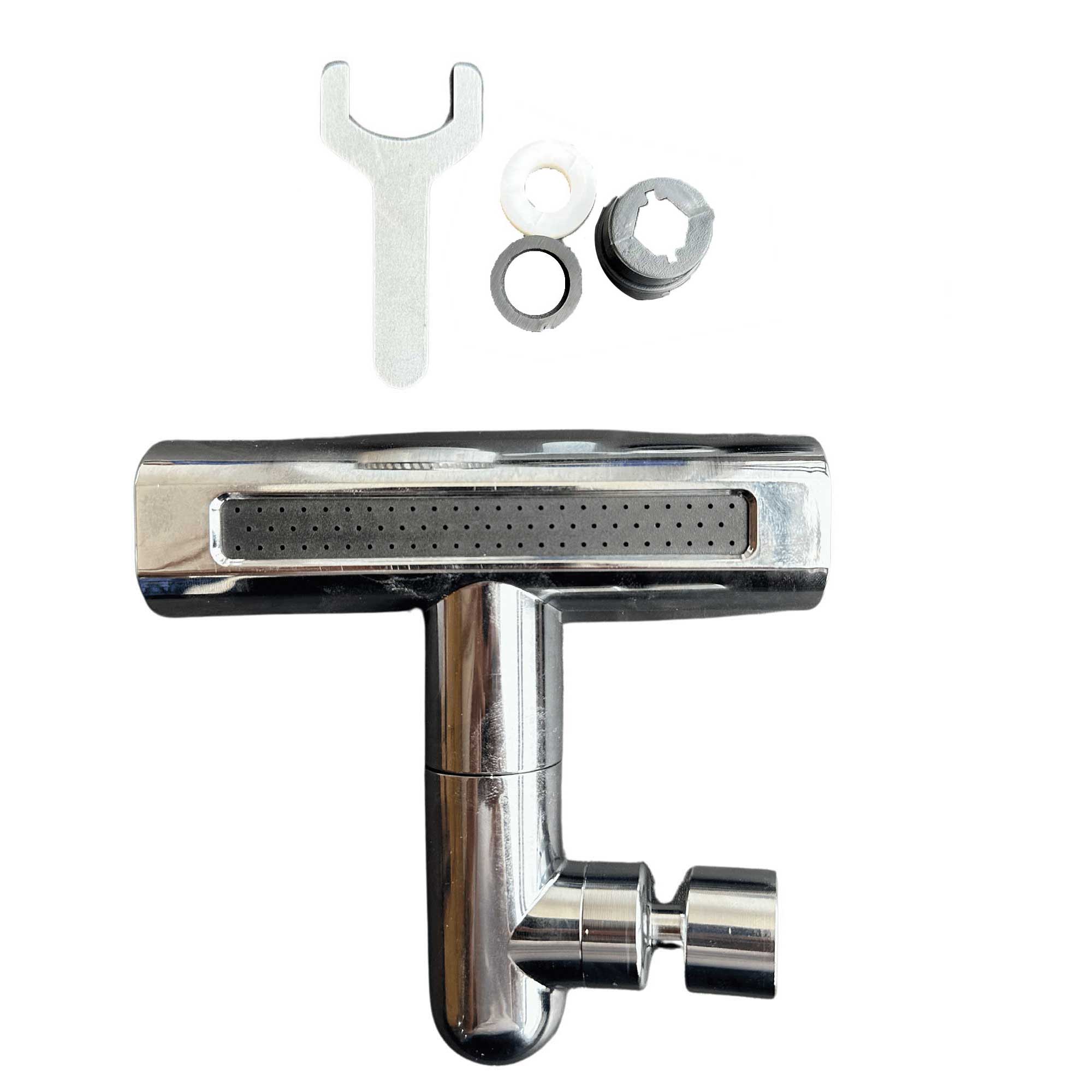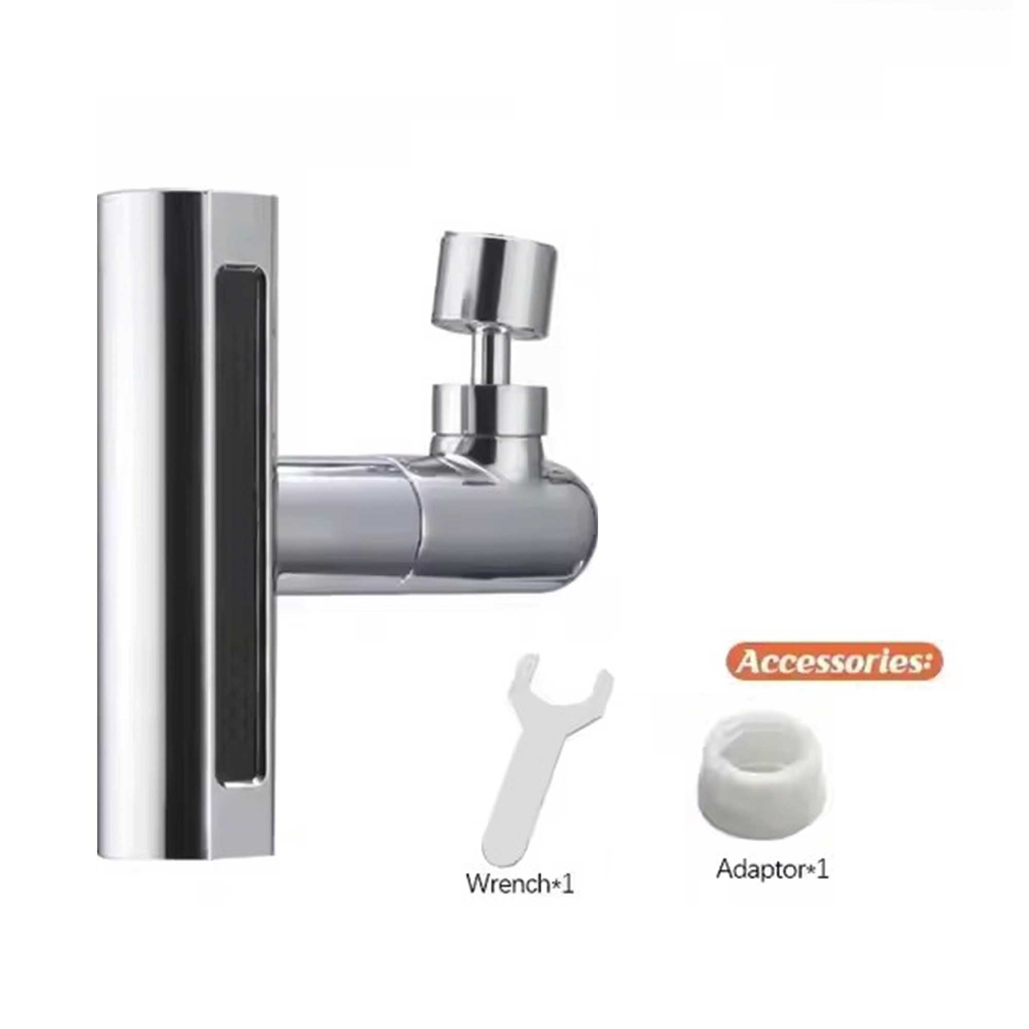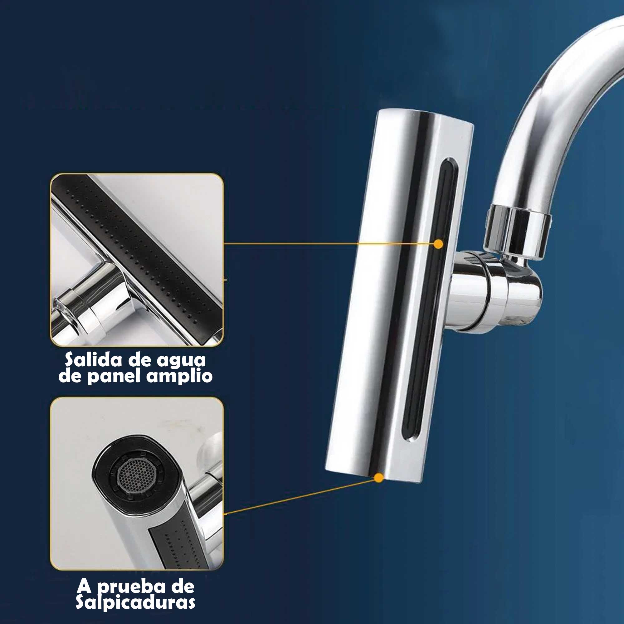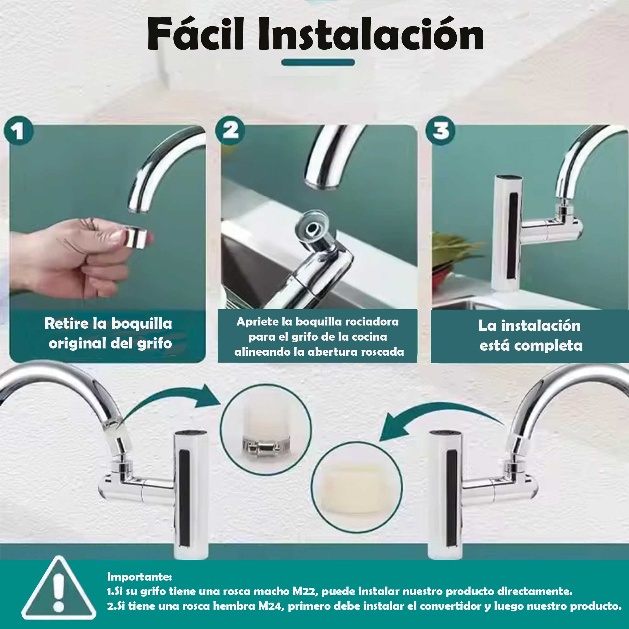 Accesorio para grifos de cocina diseñado para mejorar la funcionalidad. Se conecta al extremo del grifo existente.Puede girar en múltiples direcciones, , para facilitar el alcance del agua en diferentes áreas del fregadero.