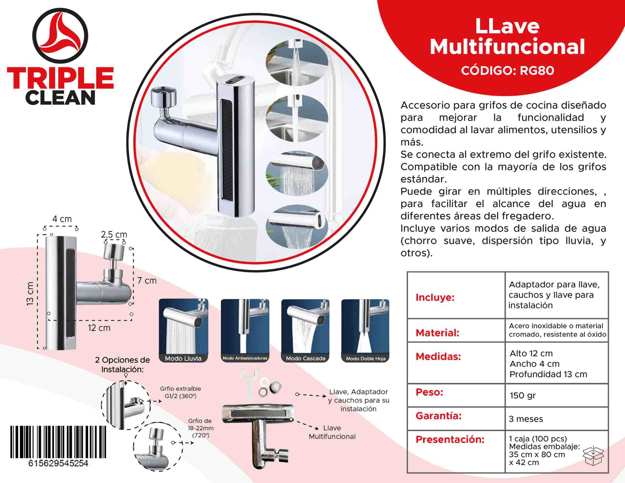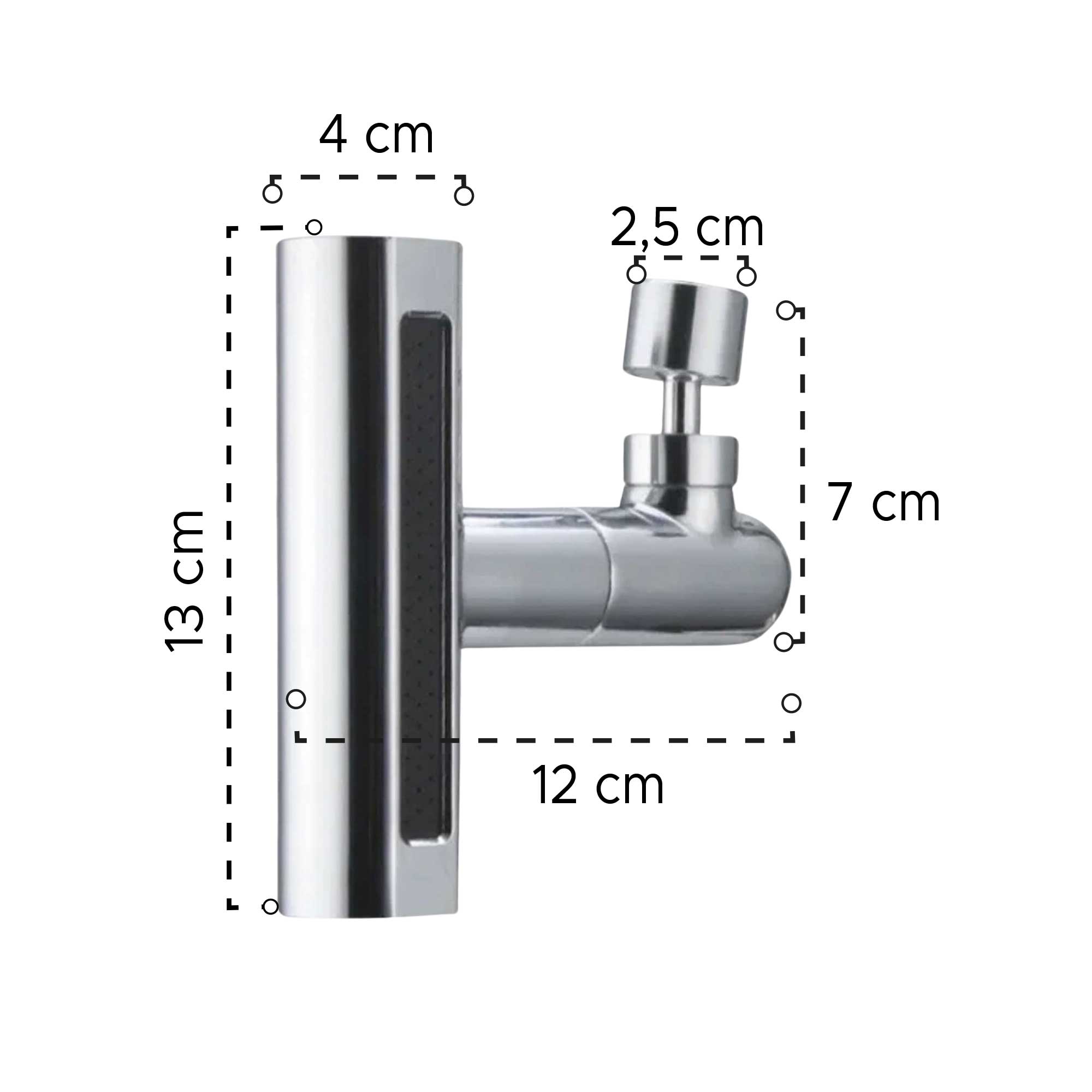 Incluye varios modos de salida de agua (chorro suave, dispersión tipo lluvia, y otros). Medidas: Alto: 12 cm x Ancho: 4 cm x Profundidad: 13 cm Material: Acero inoxidable