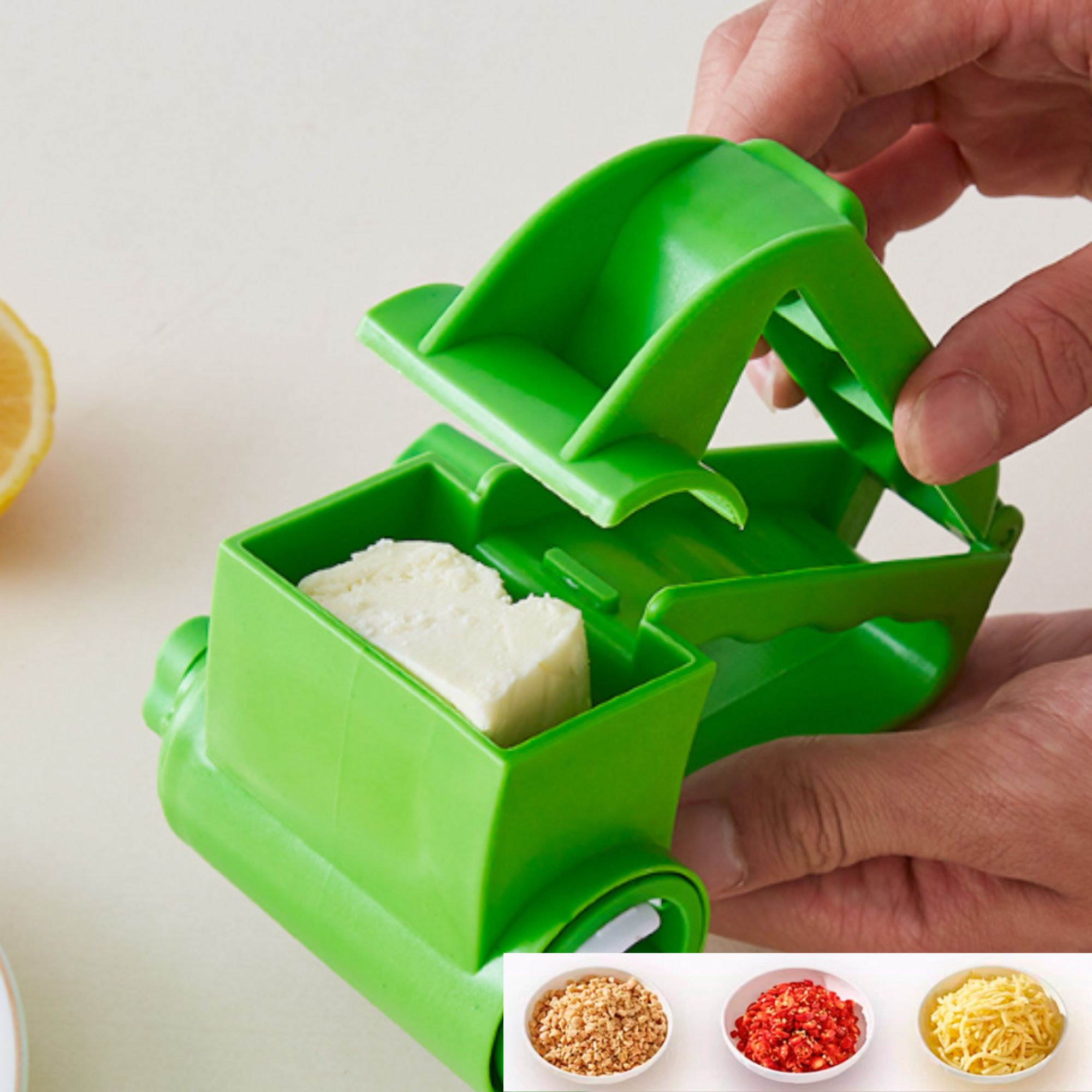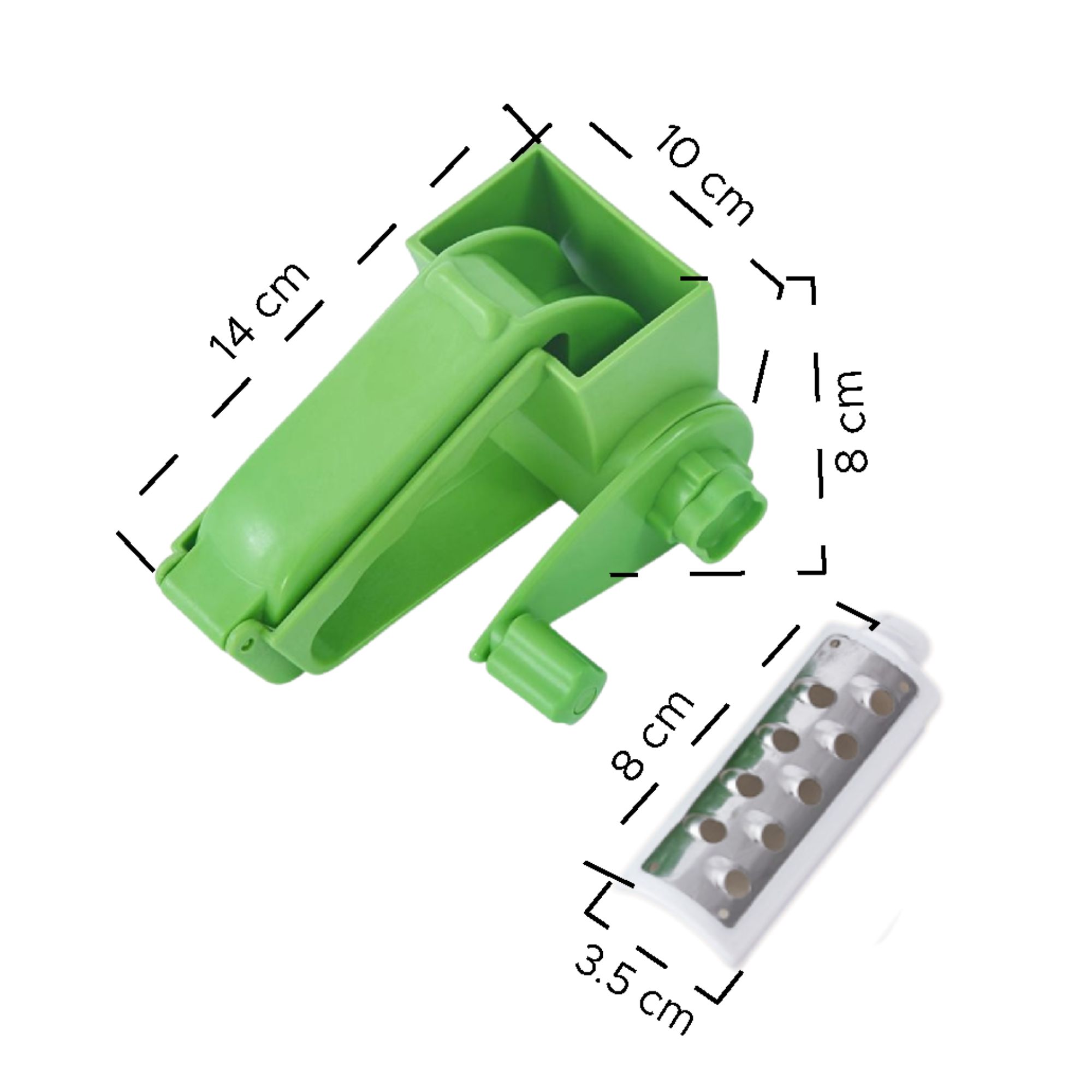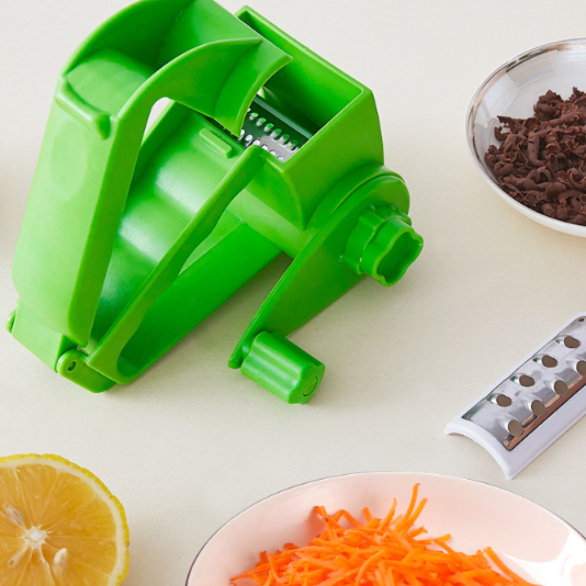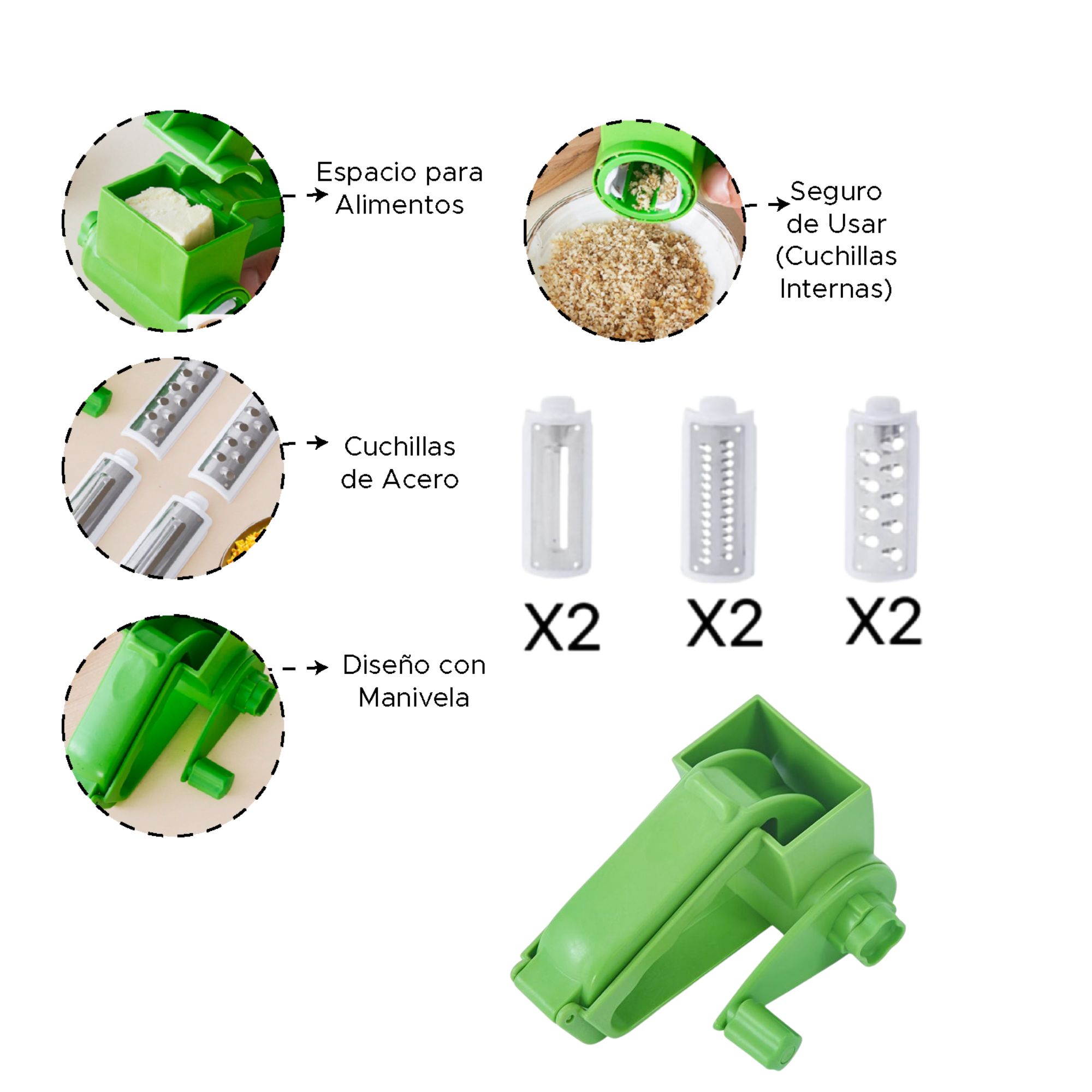 Rallador de tambor manual con manivela, ideal para rallar, cortar o rebanar queso y más. Incluye 6 cuchillas intercambiables de acero inoxidable para diferentes tipos de corte. Práctico, seguro y fácil de usar, perfecto para agilizar la preparación de alimentos en casa.