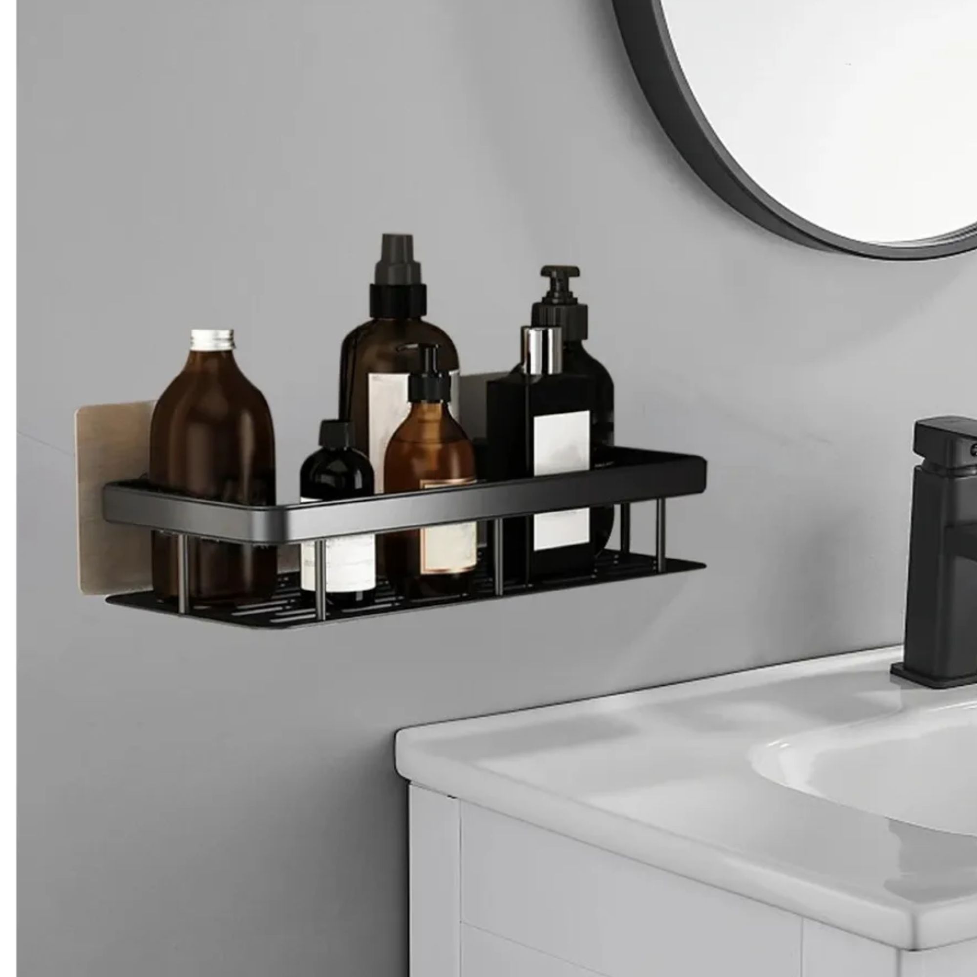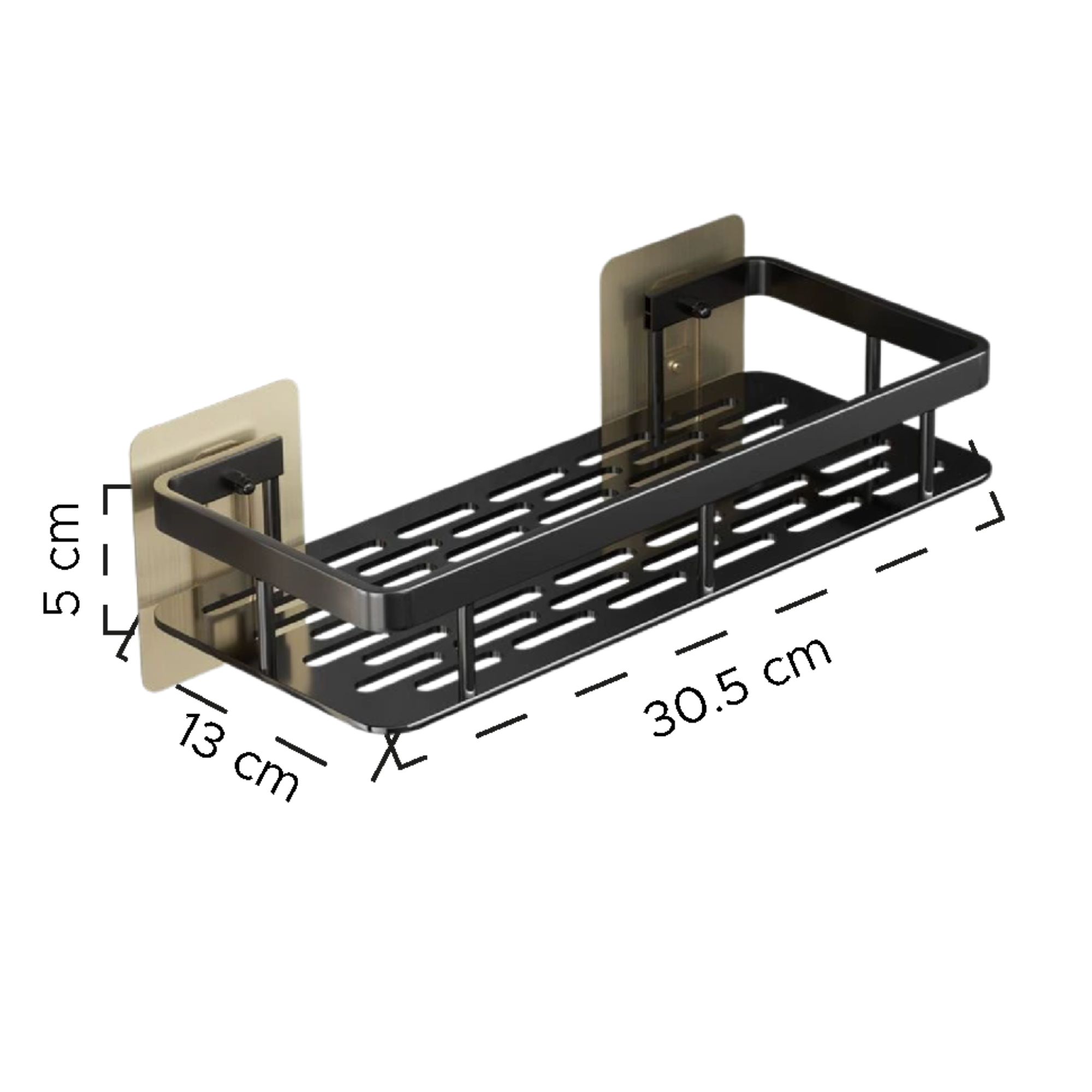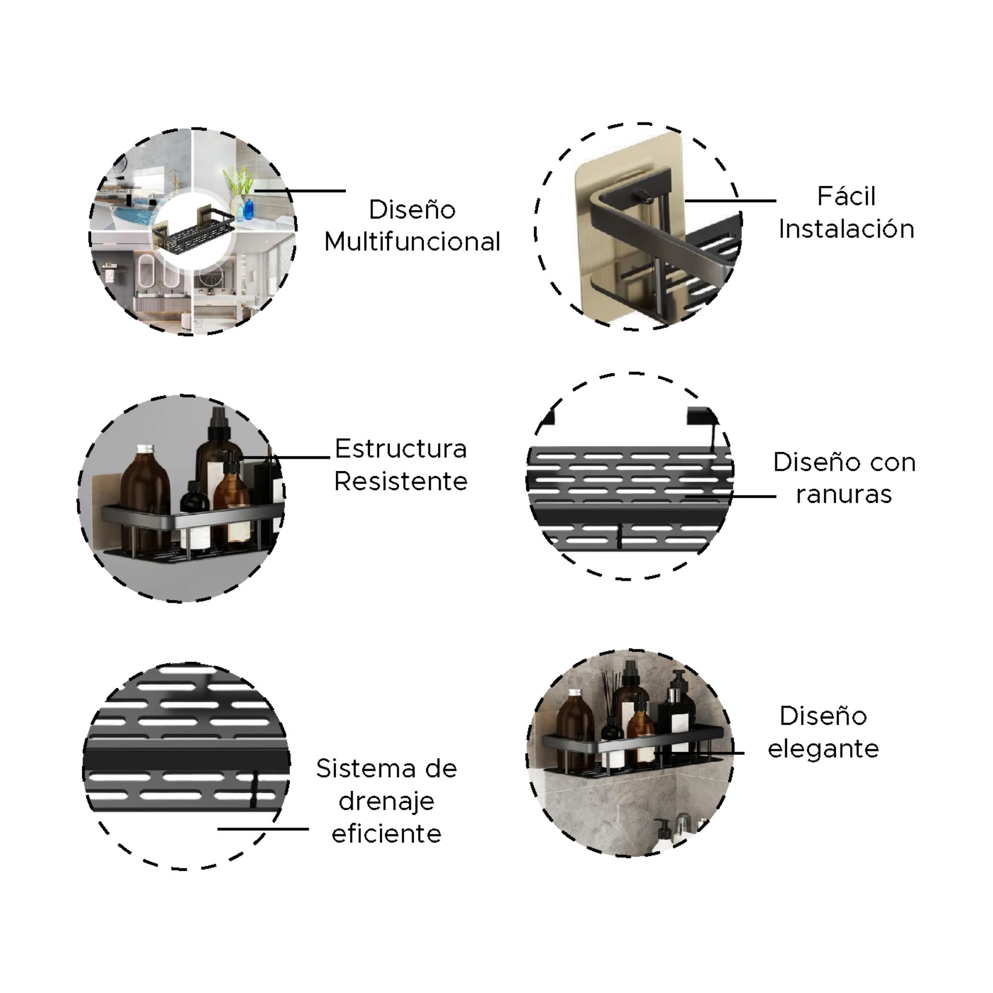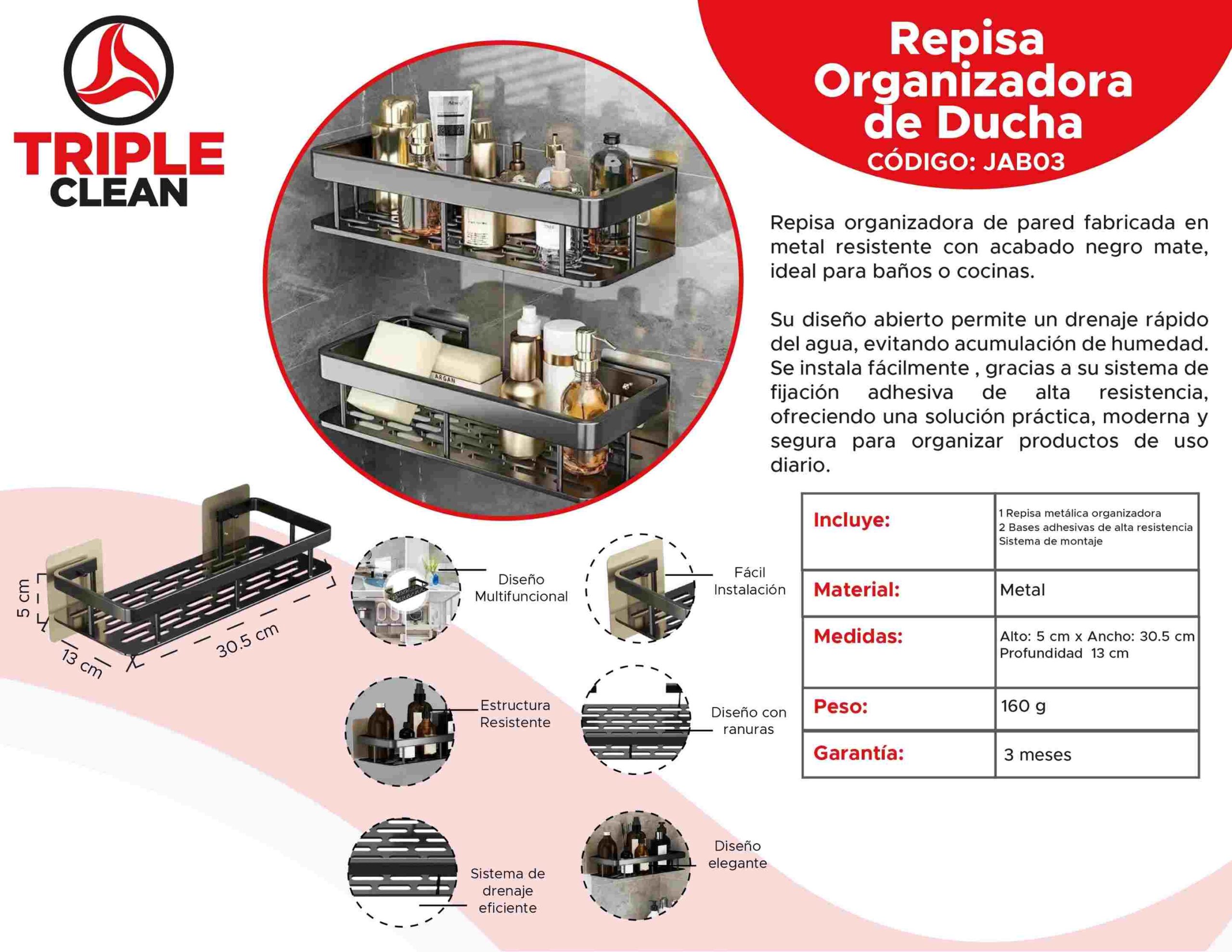 Organizador resistente elaborado en acero inoxidable con acabado negro, ideal para baño o cocina. Cuenta con drenaje inferior para evitar acumulación de humedad y sistema de instalación adhesiva.