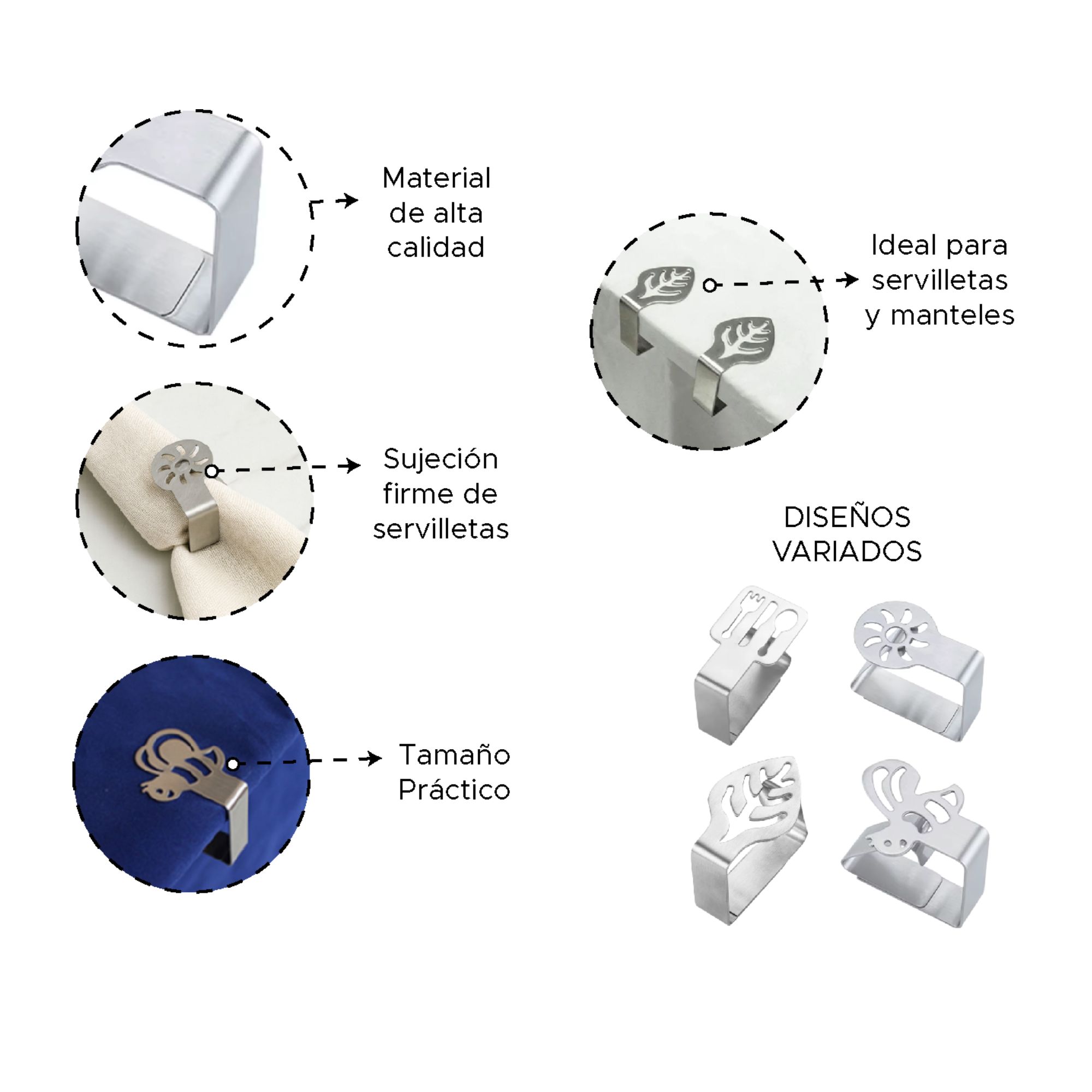 Servilleteros de tela con diseño decorativo en acero inoxidable, ideales para sujetar servilletas de forma elegante y original en la mesa. Con formas creativas (Hojas,Abejas, Sol,Cubiertos) y un ajuste firme, aportan un toque distintivo a comidas especiales, celebraciones o uso diario.