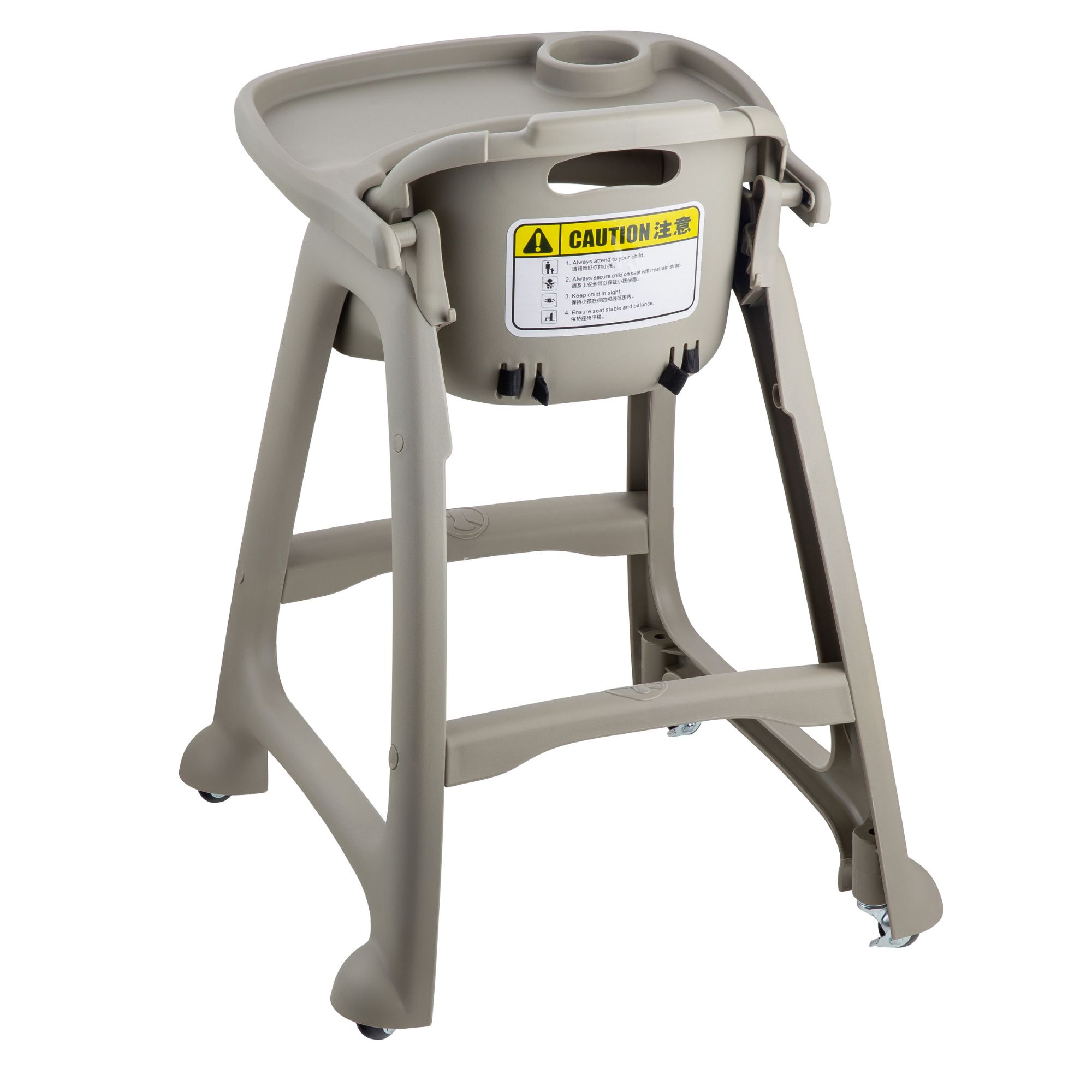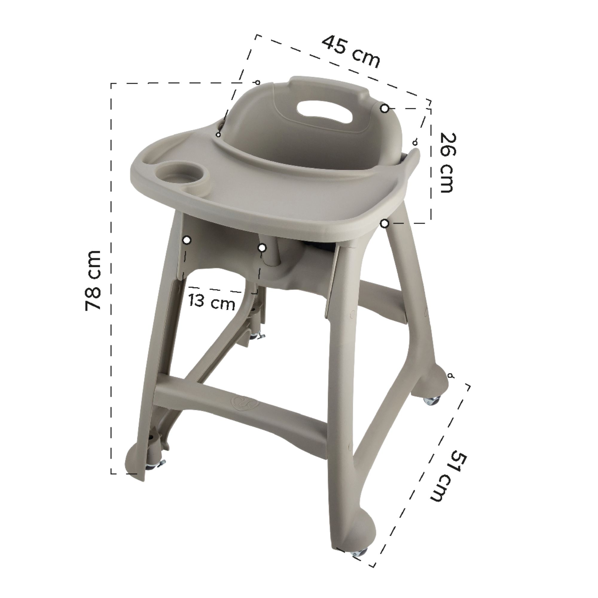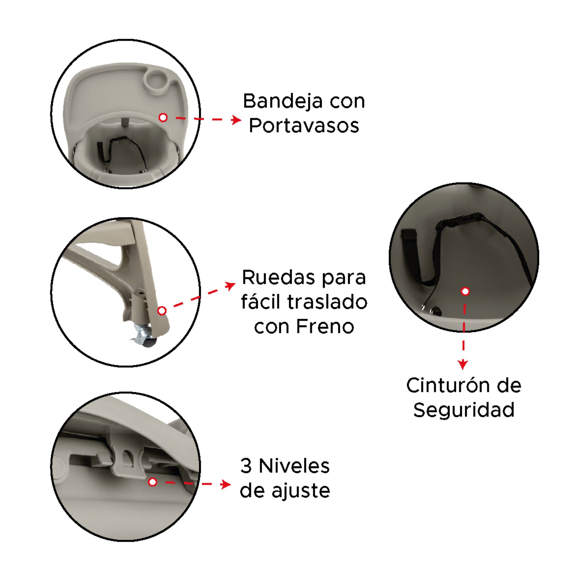 Silla alta para bebés resistente, segura y fácil de limpiar. Cuenta con una bandeja con portavasos, respaldo con asa para un fácil transporte y ruedas para mayor movilidad.