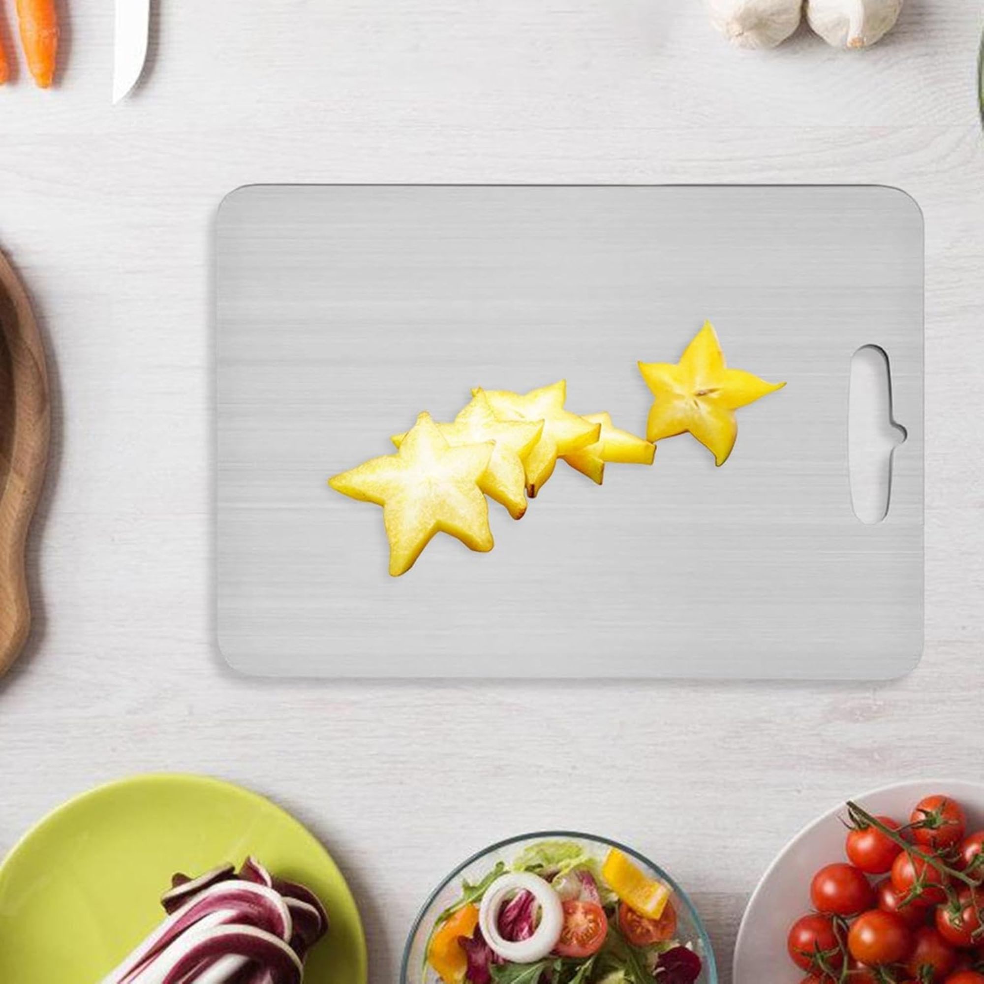 Tabla de corte fabricada en acero inoxidable de grado alimenticio, ideales para cortar carne, pescado, frutas y verduras.