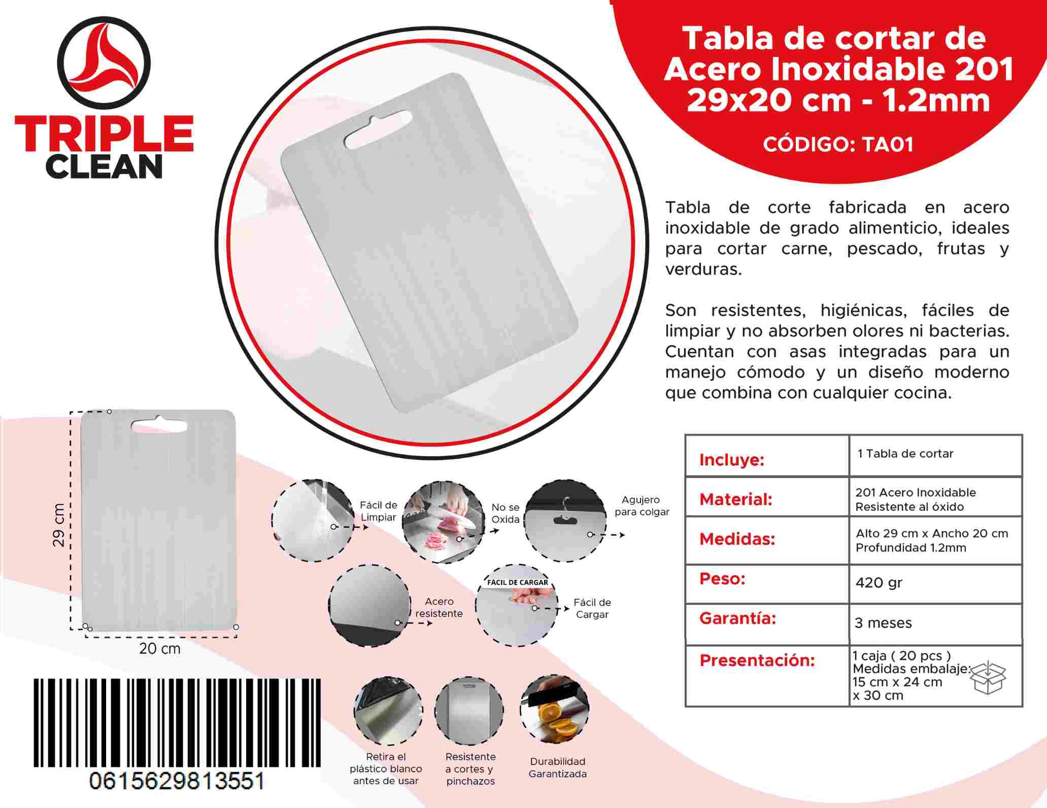 Medidas: TA01 ( Alto 29 cm x Ancho 20 cm Profundidad 1.2mm ) Material: Acero Inoxidable