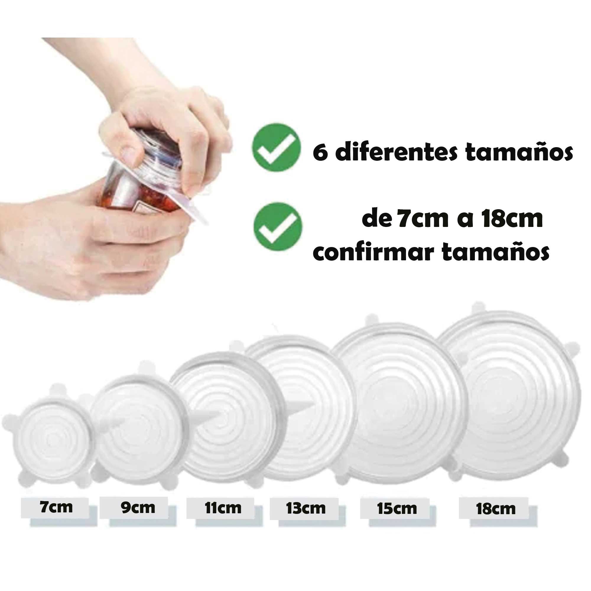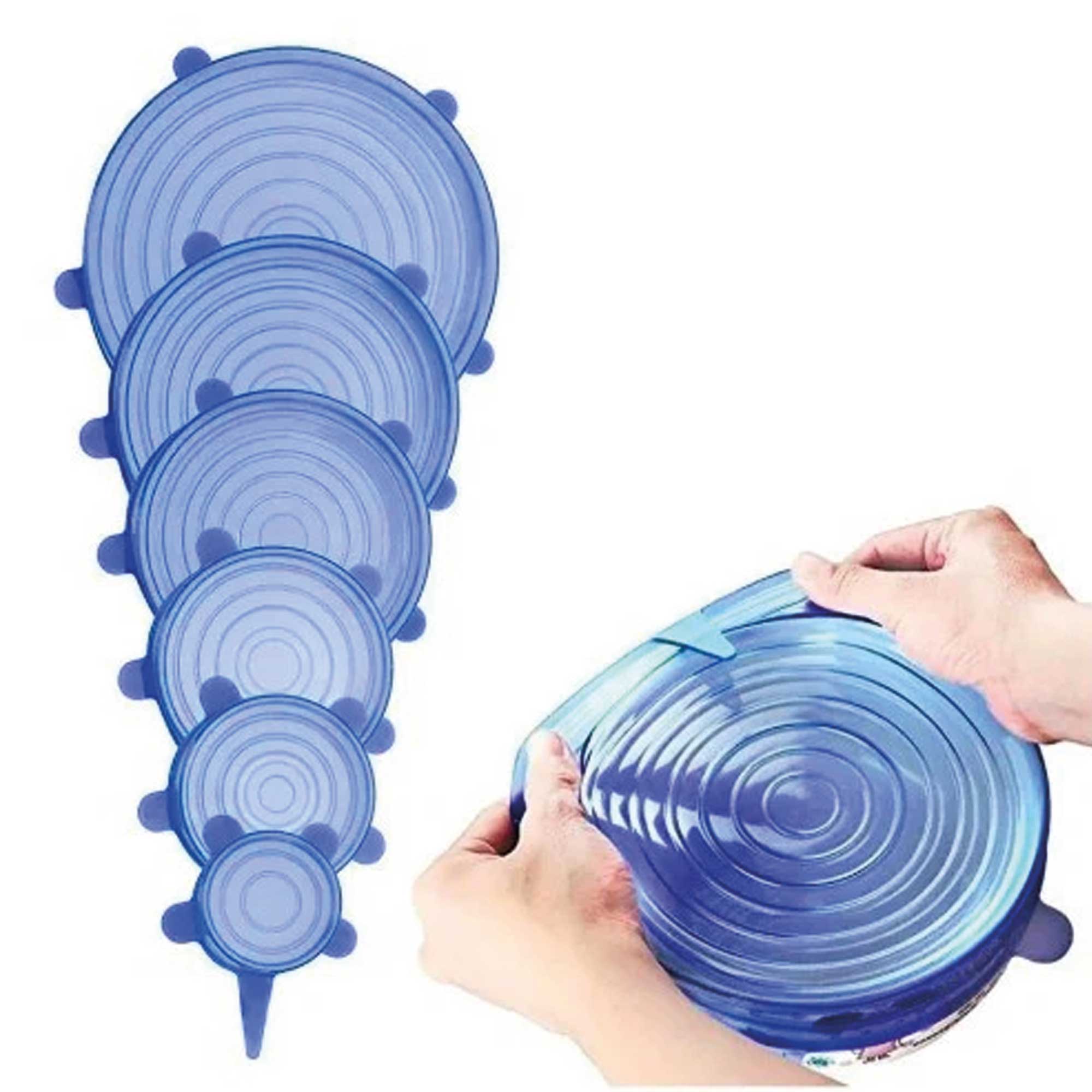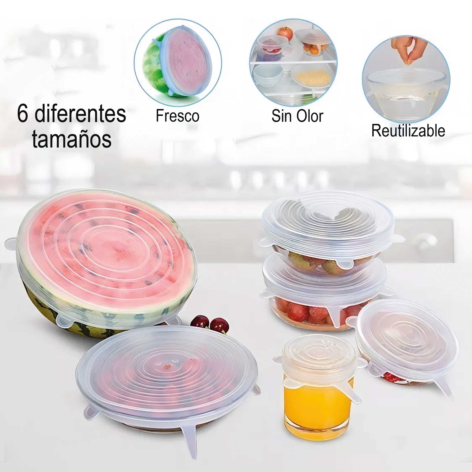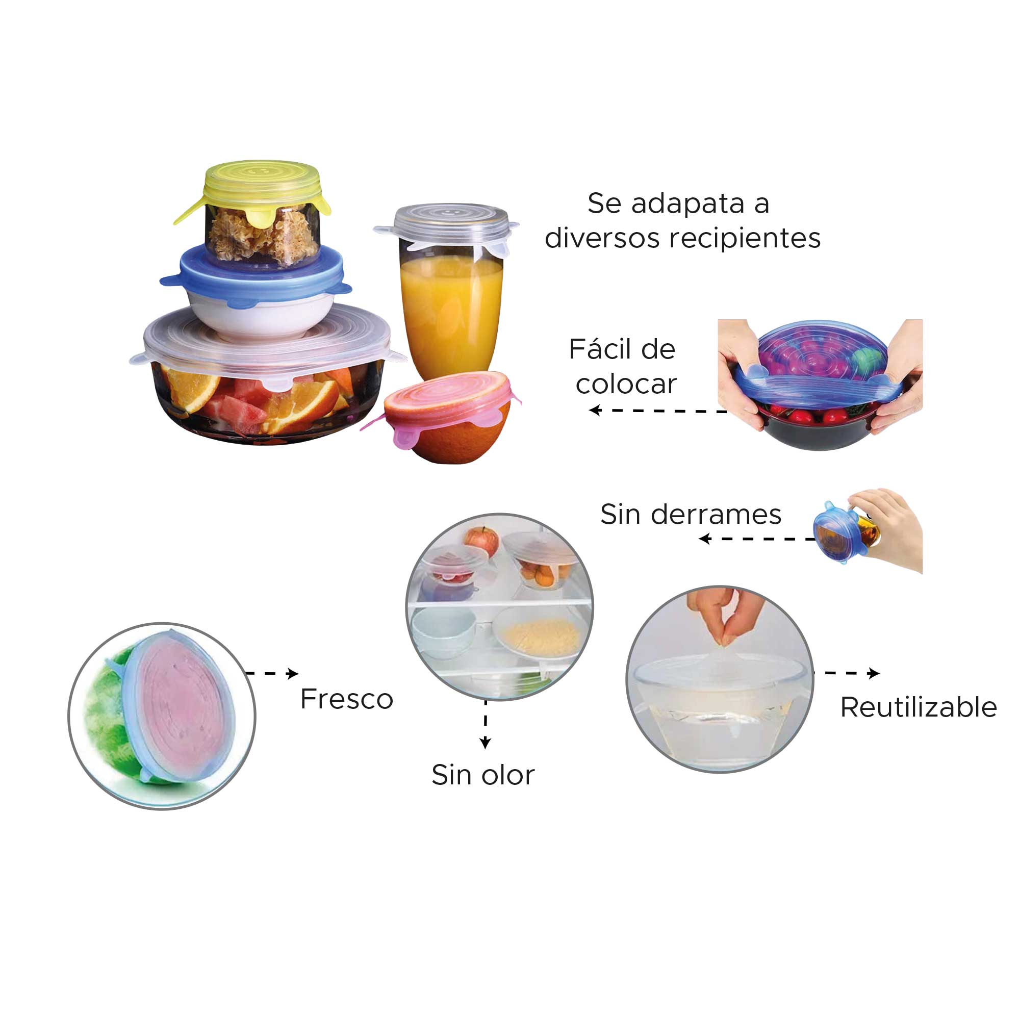 Conjunto de tapas de silicona reutilizables, flexibles y herméticas, compatibles con recipientes de diversos tamaños y formas. Incluye varios tamaños, ideales para cubrir tazones, latas o platos.