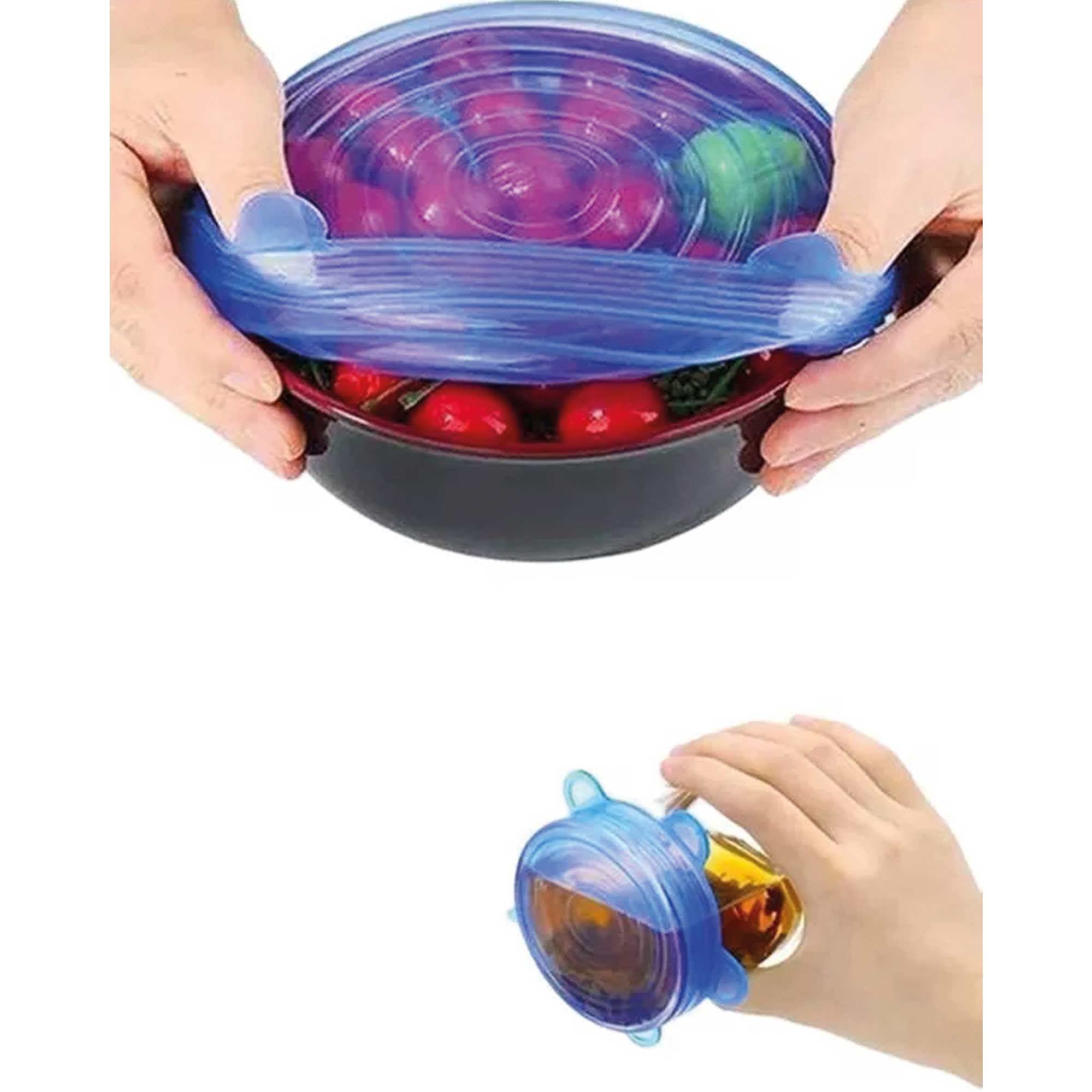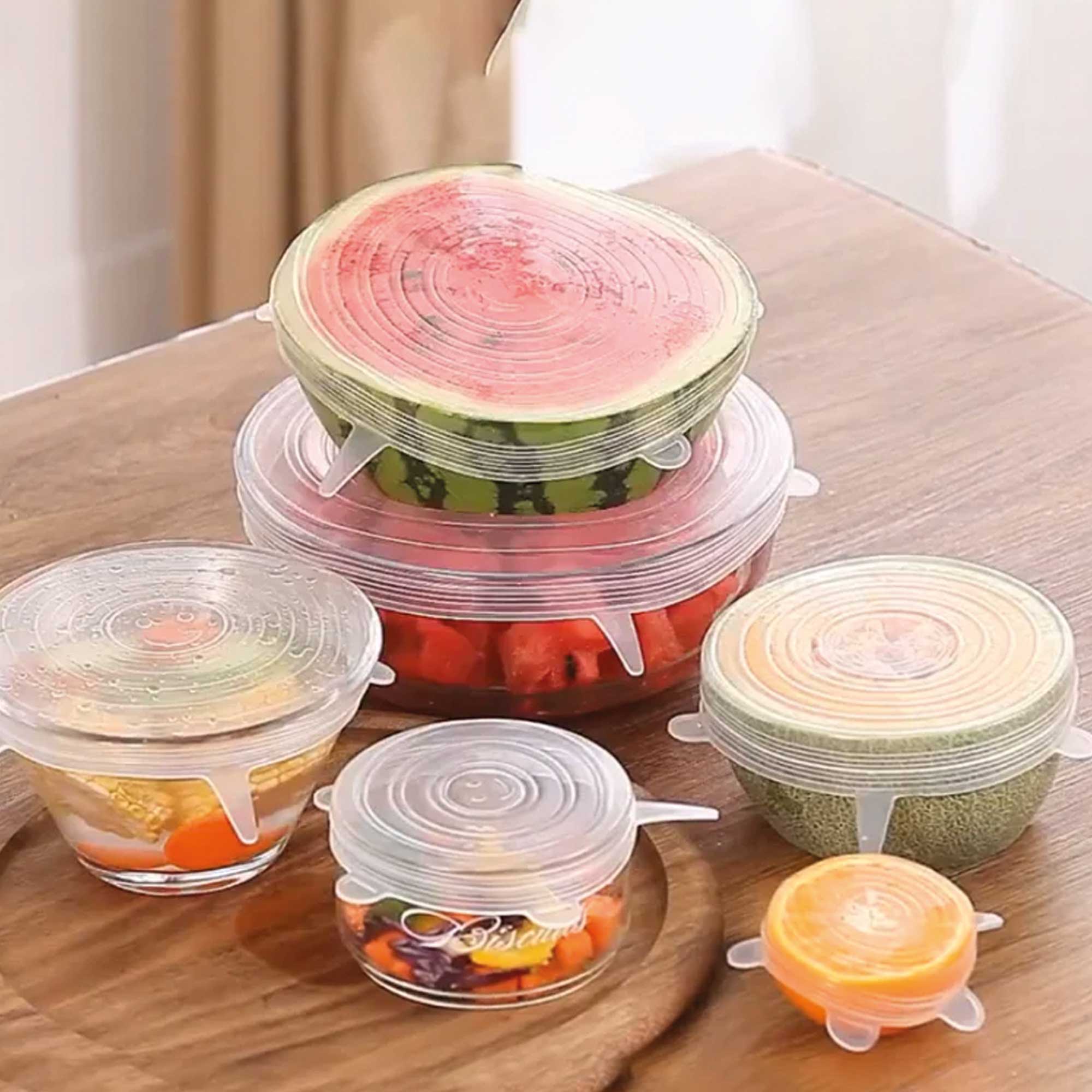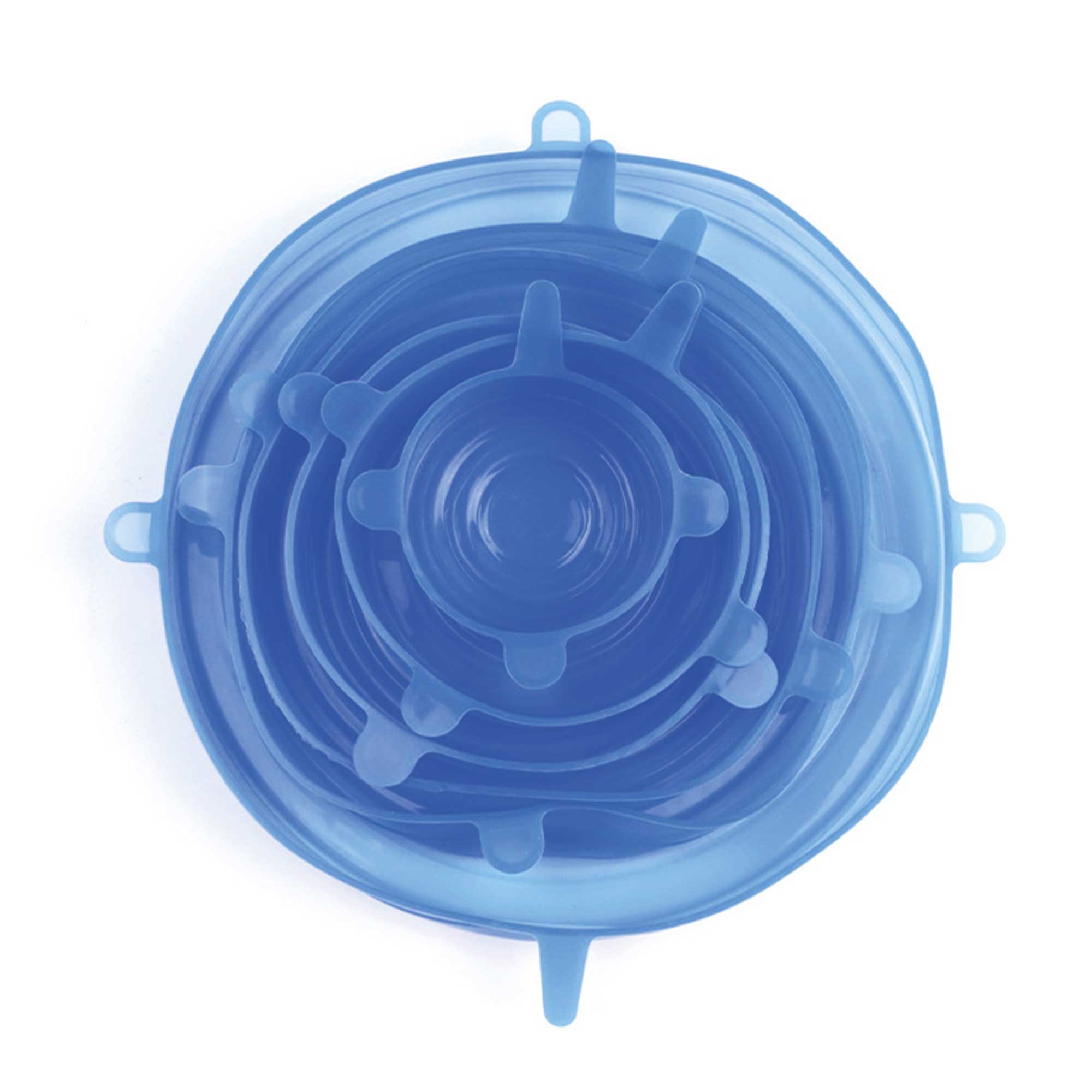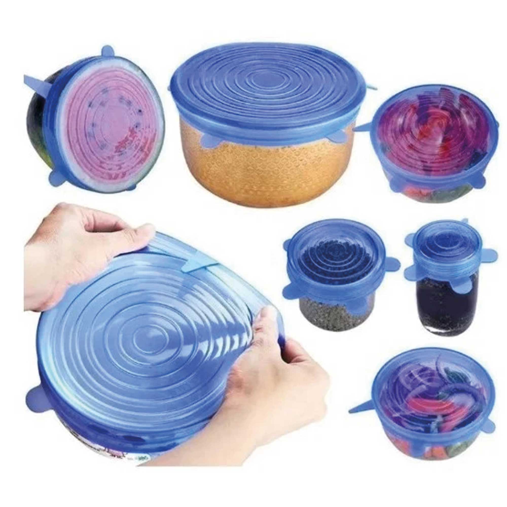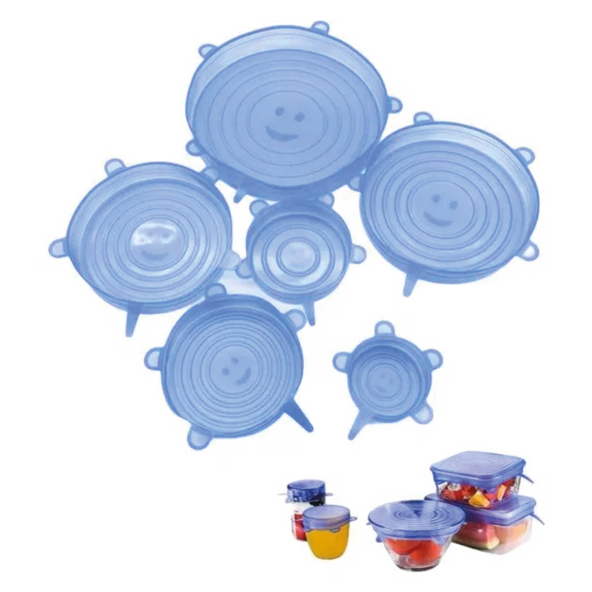 Conjunto de tapas de silicona reutilizables, flexibles y herméticas, compatibles con recipientes de diversos tamaños y formas. Incluye varios tamaños, ideales para cubrir tazones, latas o platos.